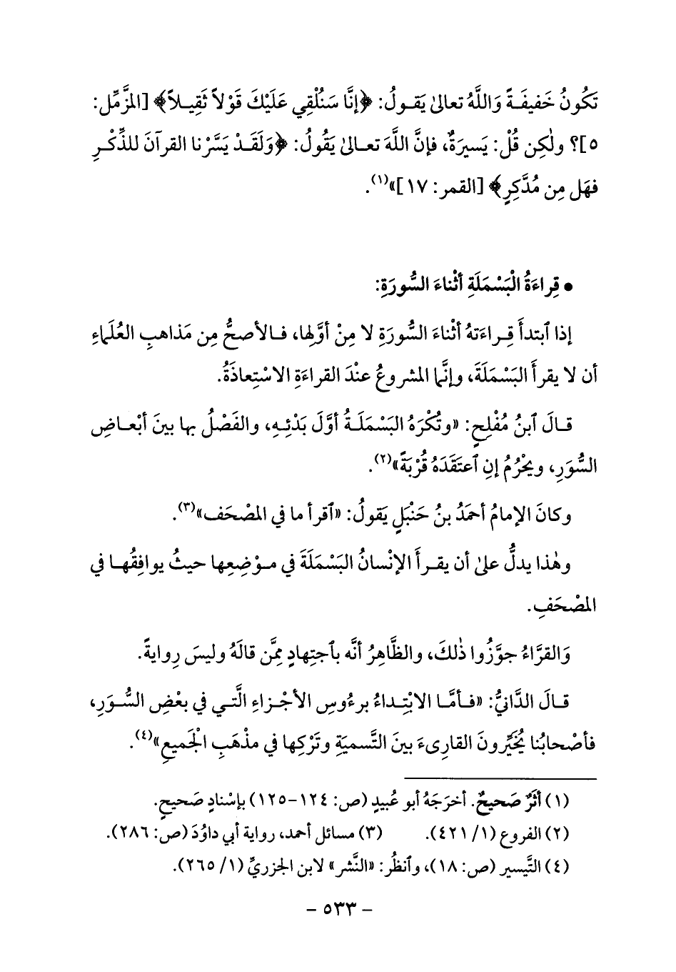 قال ابن مفلح: «وتكره البسملة أوّل بدئه، والفصل بها بين أبعاض السّور، ويحرم إن اعتقده قربة» (¬2).