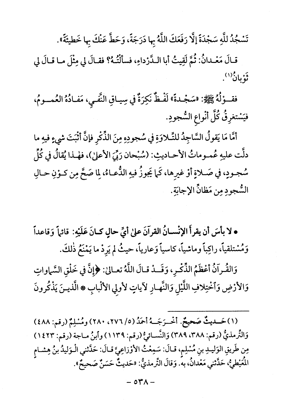 فقوله صلى الله عليه وسلم: «سجدة» لفظ نكرة في سياق النّفي، مفاده العموم، فيستغرق كلّ أنواع السّجود.