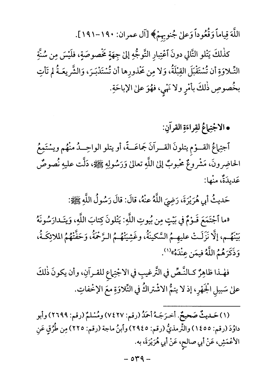 اجتماع القوم يتلون القرآن جماعة، أو يتلو الواحد منهم ويستمع الحاضرون، مشروع محبوب إلى الله تعالى ورسوله صلى الله عليه وسلم، دلّت عليه نصوص عديدة، منها:
