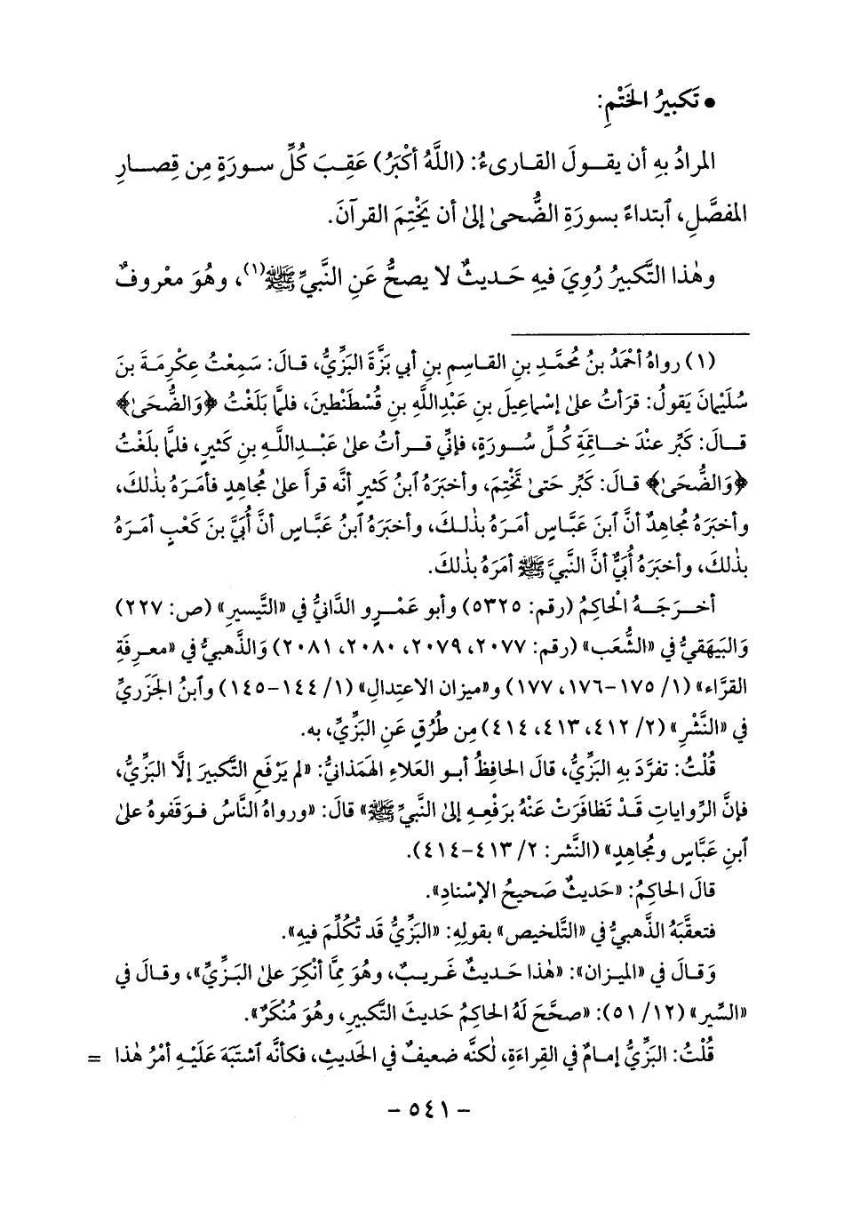 (¬1) رواه أحمد بن محمّد بن القاسم بن أبي بزّة البزّيّ، قال: سمعت عكرمة بن سليمان يقول: قرأت على إسماعيل بن عبد الله بن قسطنطين، فلمّا بلغت وَالضُّحى 1 قال: كبّر عند خاتمة كلّ سورة، فإنّي قرأت على عبد الله بن كثير، فلمّا بلغت وَالضُّحى 1 قال: كبّر حتى تختم، وأخبره ابن كثير أنّه قرأ على مجاهد فأمره بذلك، وأخبره مجاهد أنّ ابن عبّاس أمره بذلك، وأخبره ابن عبّاس أنّ أبيّ بن كعب أمره بذلك، وأخبره أبيّ أنّ النّبيّ صلى الله عليه وسلم أمره بذلك.