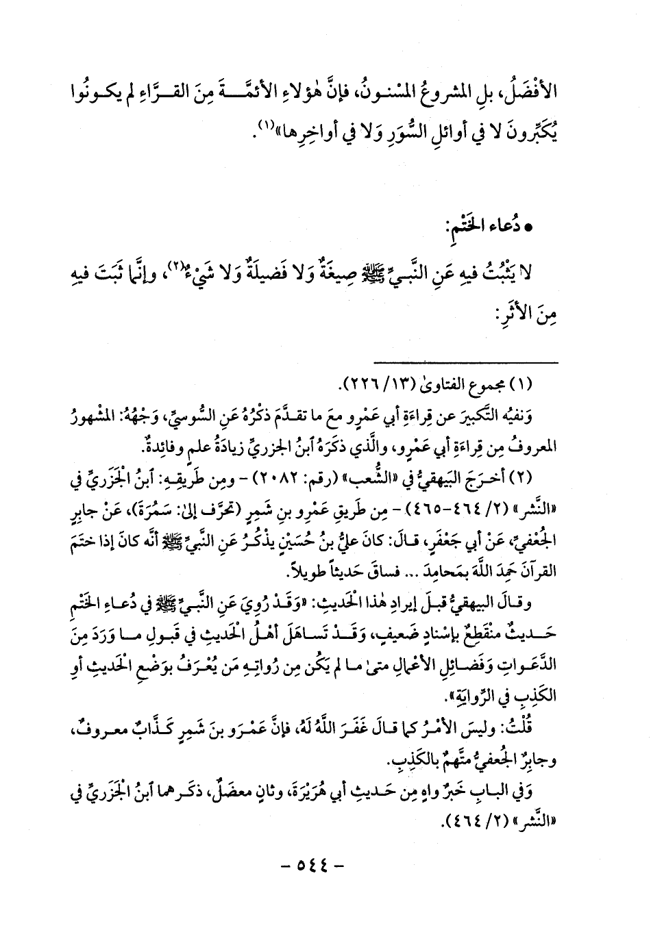 (¬2) أخرج البيهقيّ في «الشّعب» (رقم: 2082) - ومن طريقه: ابن الجزريّ في «النّشر» (2/ 464 - 465) - من طريق عمرو بن شمر (تحرّف إلى: سمرة)، عن جابر الجعفيّ، عن أبي جعفر، قال: كان عليّ بن حسين يذكر عن النّبيّ صلى الله عليه وسلم أنّه كان إذا ختم القرآن حمد الله بمحامد ... فساق حديثا طويلا.
