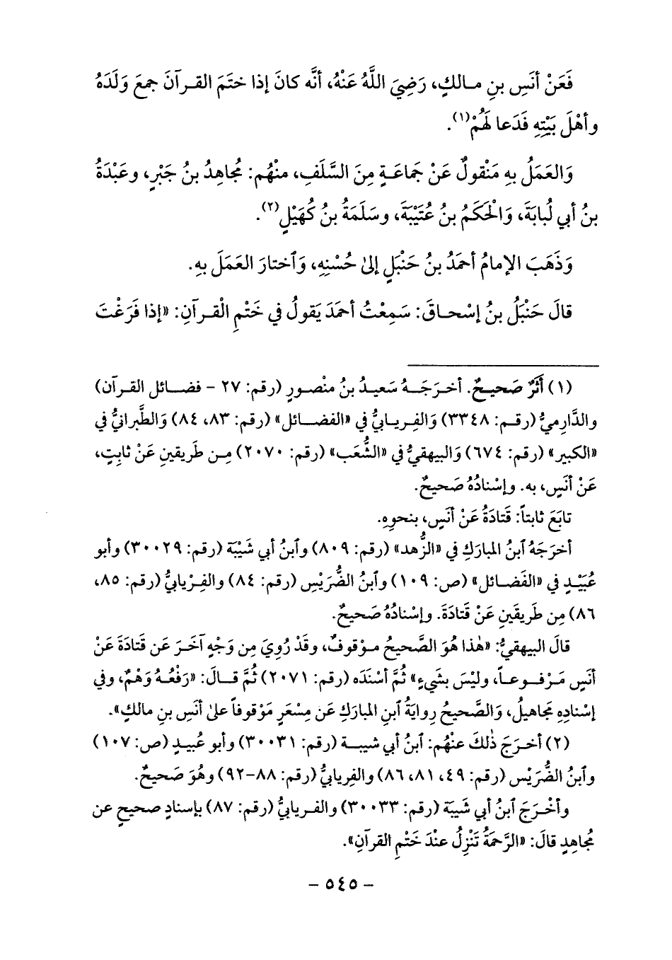 وأخرج ابن أبي شيبة (رقم: 30033) والفريابيّ (رقم: 87) بإسناد صحيح عن مجاهد قال: «الرّحمة تنزل عند ختم القرآن»