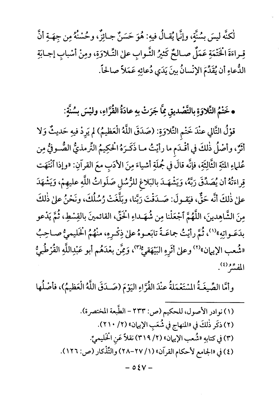 قول التّالي عند ختم التّلاوة: (صدق الله العظيم) لم يرد فيه حديث ولا أثر، وأصل ذلك في أقدم ما رأيت ما ذكره الحكيم التّرمذيّ الصّوفيّ من علماء المائة الثّالثة، فإنّه قال في جملة أشياء من الأدب مع القرآن: «وإذا انتهت قراءته أن يصدّق ربّه، ويشهد بالبلاغ للرّسل صلوات الله عليهم، ويشهد على ذلك أنّه حقّ، فيقول: صدقت ربّنا، وبلّغت رسلك، ونحن على ذلك من الشّاهدين، اللهمّ اجعلنا من شهداء الحقّ، القائمين بالقسط، ثمّ يدعو بدعواته» (¬1)، ثمّ رأيت جماعة