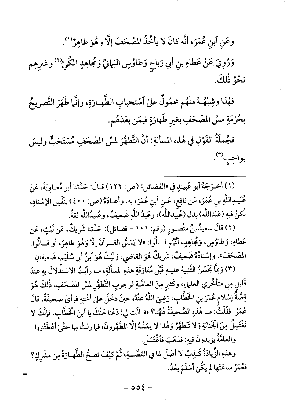 (¬2) قال سعيد بن منصور (رقم: 101 - فضائل): حدّثنا شريك، عن ليث، عن عطاء، وطاوس، ومجاهد، أنّهم قالوا: «لا يمسّ القرآن إلّا وهو طاهر، أو قالوا: المصحف». وإسناده ضعيف، شريك هو القاضي، وليث هو ابن أبي سليم، ضعيفان.