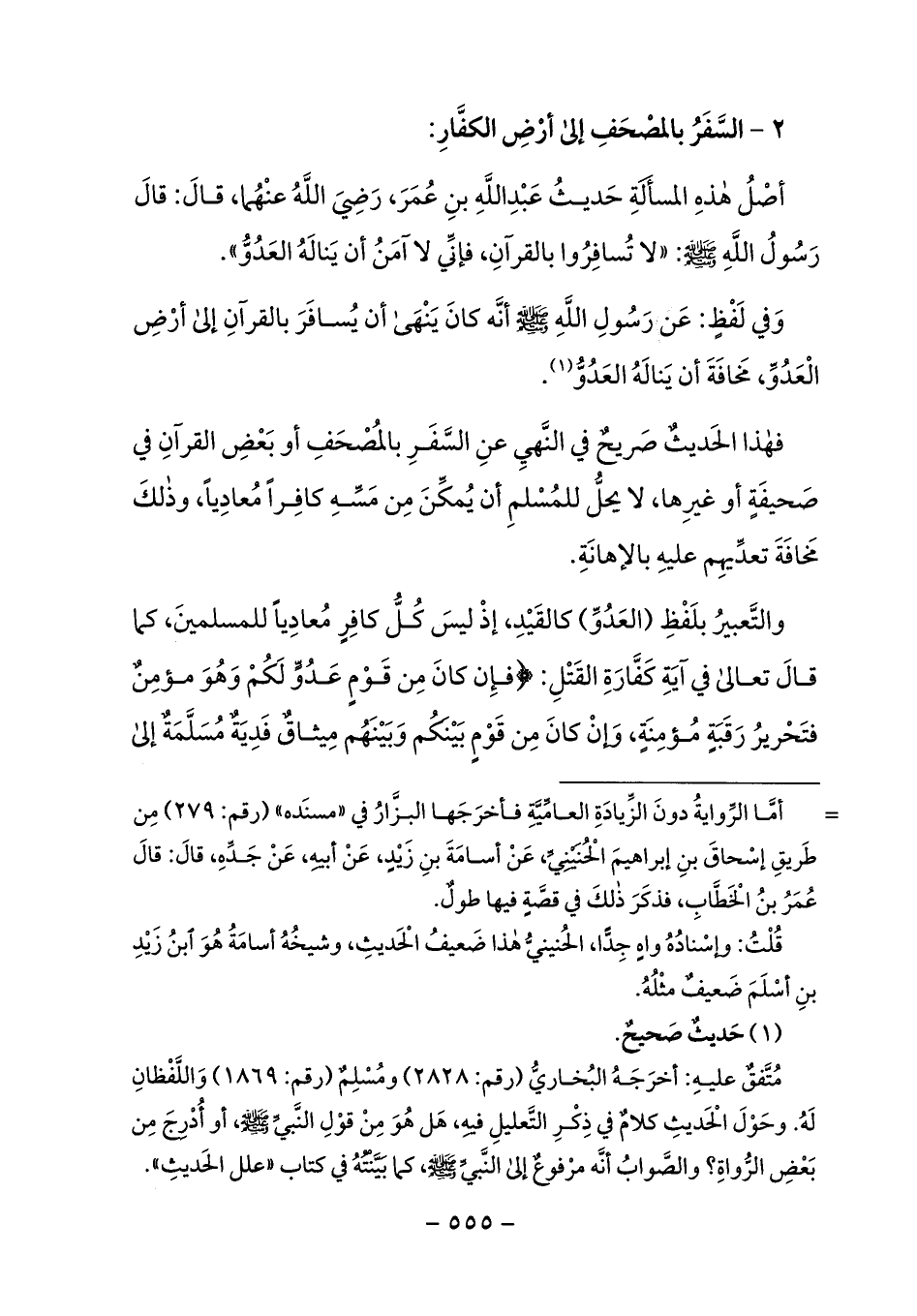 فهذا الحديث صريح في النّهي عن السّفر بالمصحف أو بعض القرآن في صحيفة أو غيرها، لا يحلّ للمسلم أن يمكّن من مسّه كافرا معاديا، وذلك مخافة تعدّيهم عليه بالإهانة.
