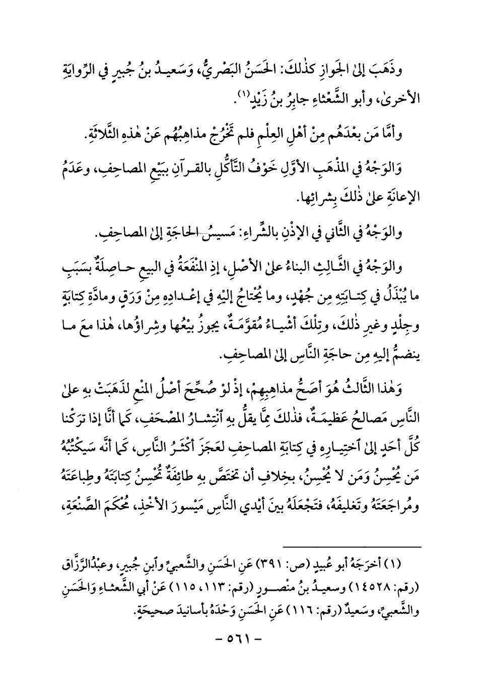 وهذا الثّالث هو أصحّ مذاهبهم، إذ لو صحّح أصل المنع لذهبت به على النّاس مصالح عظيمة، فذلك ممّا يقلّ به انتشار المصحف، كما أنّا إذا تركنا كلّ أحد إلى اختياره في كتابة المصاحف لعجز أكثر النّاس، كما أنّه سيكتبه من يحسن ومن لا يحسن، بخلاف أن تختصّ به طائفة تحسن كتابته وطباعته ومراجعته وتغليفه، فتجعله بين أيدي النّاس ميسور الأخذ، محكم الصّنعة،