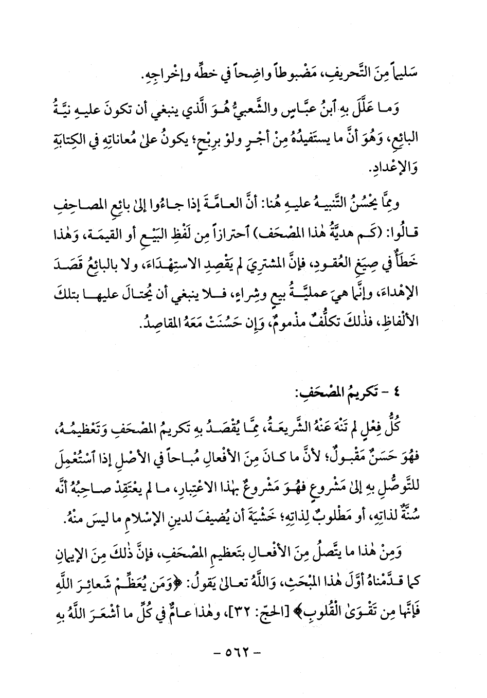 وممّا يحسن التّنبيه عليه هنا: أنّ العامّة إذا جاءوا إلى بائع المصاحف قالوا: (كم هديّة هذا المصحف) احترازا من لفظ البيع أو القيمة، وهذا خطأ في صيغ العقود، فإنّ المشتري لم يقصد الاستهداء، ولا بالبائع قصد الإهداء، وإنّما هي عمليّة بيع وشراء، فلا ينبغي أن يحتال عليها بتلك الألفاظ، فذلك تكلّف مذموم، وإن حسنت معه المقاصد.