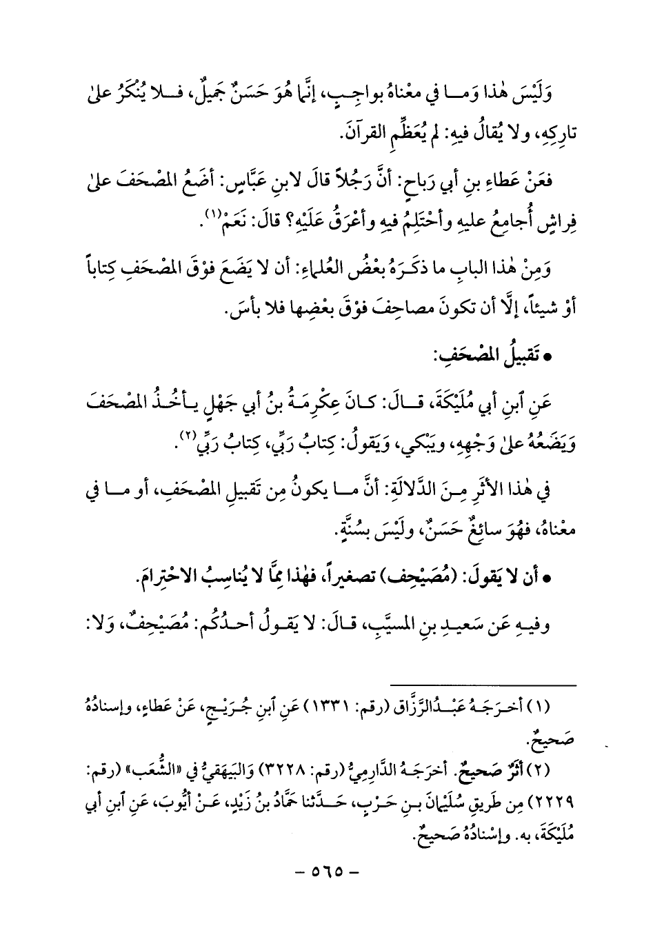 ومن هذا الباب ما ذكره بعض العلماء: أن لا يضع فوق المصحف كتابا أو شيئا، إلّا أن تكون مصاحف فوق بعضها فلا بأس.