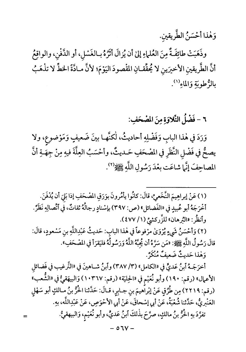 ورد في هذا الباب وفضله أحاديث، لكنّها بين ضعيف وموضوع، ولا يصحّ في فضل النّظر في المصحف حديث، وأحسب العلّة فيه من جهة أنّ المصاحف إنّما شاعت بعد رسول الله صلى الله عليه وسلم (¬2).
