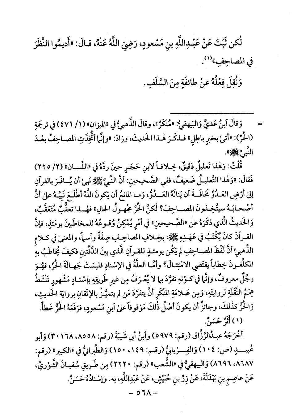 لكن ثبت عن عبد الله بن مسعود، رضي الله عنه، قال: «أديموا النّظر في المصاحف» (¬1).
