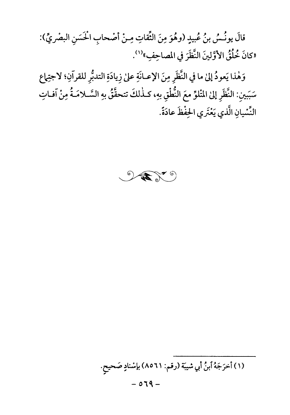 قال يونس بن عبيد (وهو من الثّقات من أصحاب الحسن البصريّ): «كان خلق الأوّلين النّظر في المصاحف» (¬1).