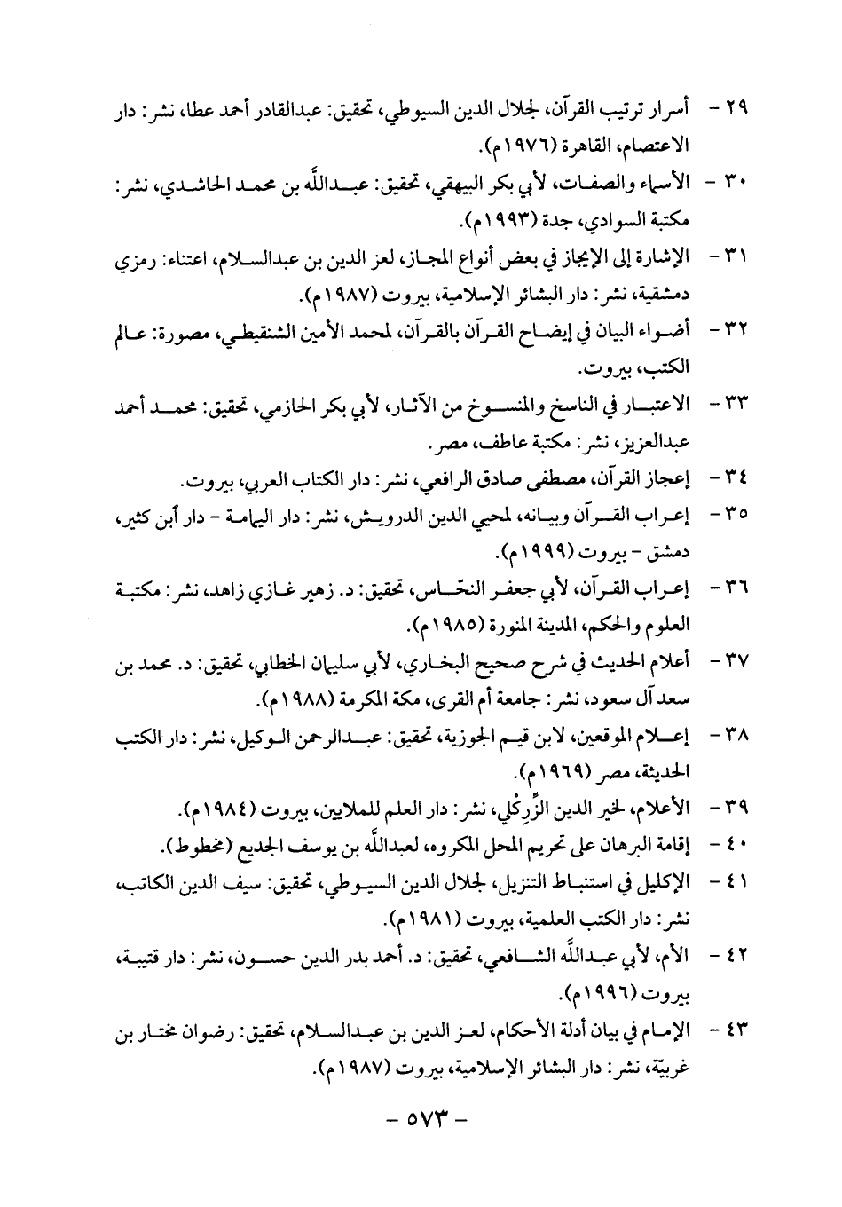 29 - أسرار ترتيب القرآن، لجلال الدين السيوطي، تحقيق: عبد القادر أحمد عطا، نشر: دار الاعتصام، القاهرة (1976 م).