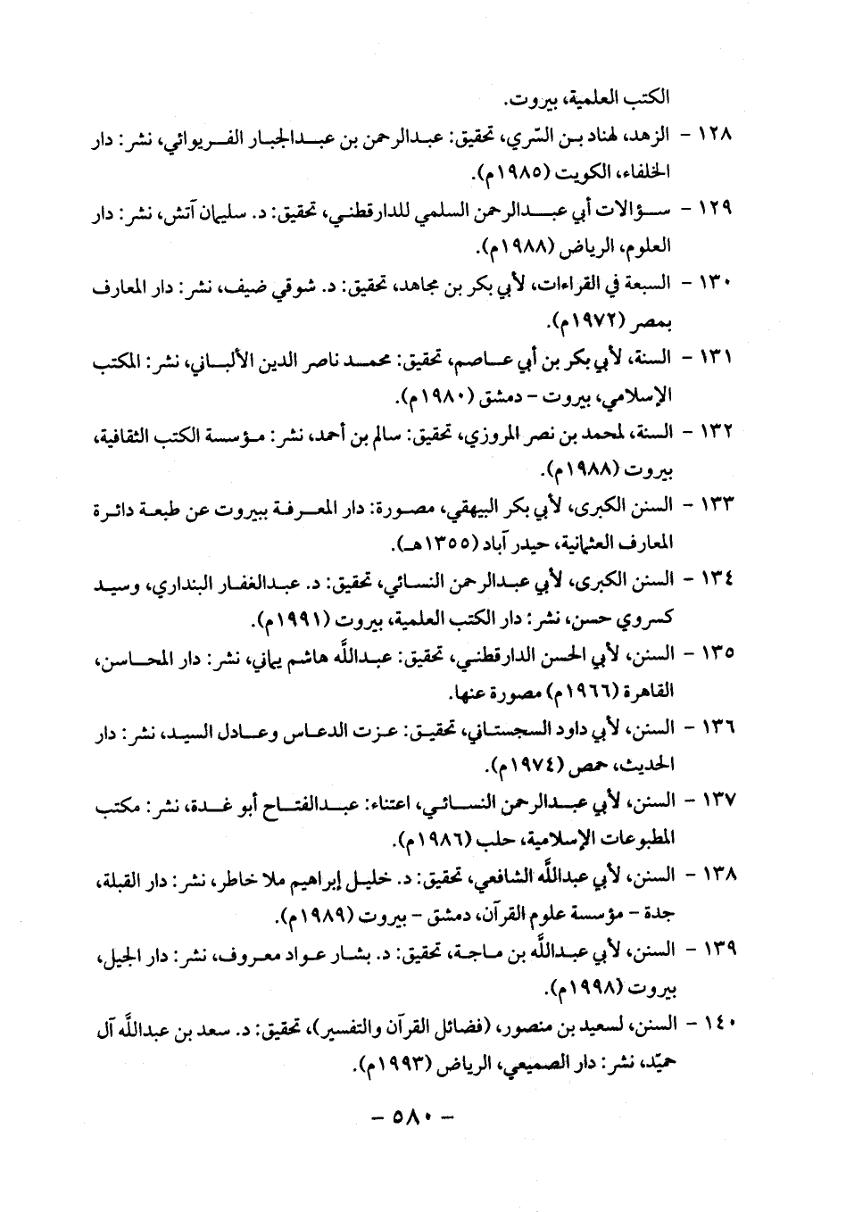 137 - السنن، لأبي عبد الرحمن النسائي، اعتناء: عبد الفتاح أبو غدة، نشر: مكتب المطبوعات الإسلامية، حلب (1986 م).