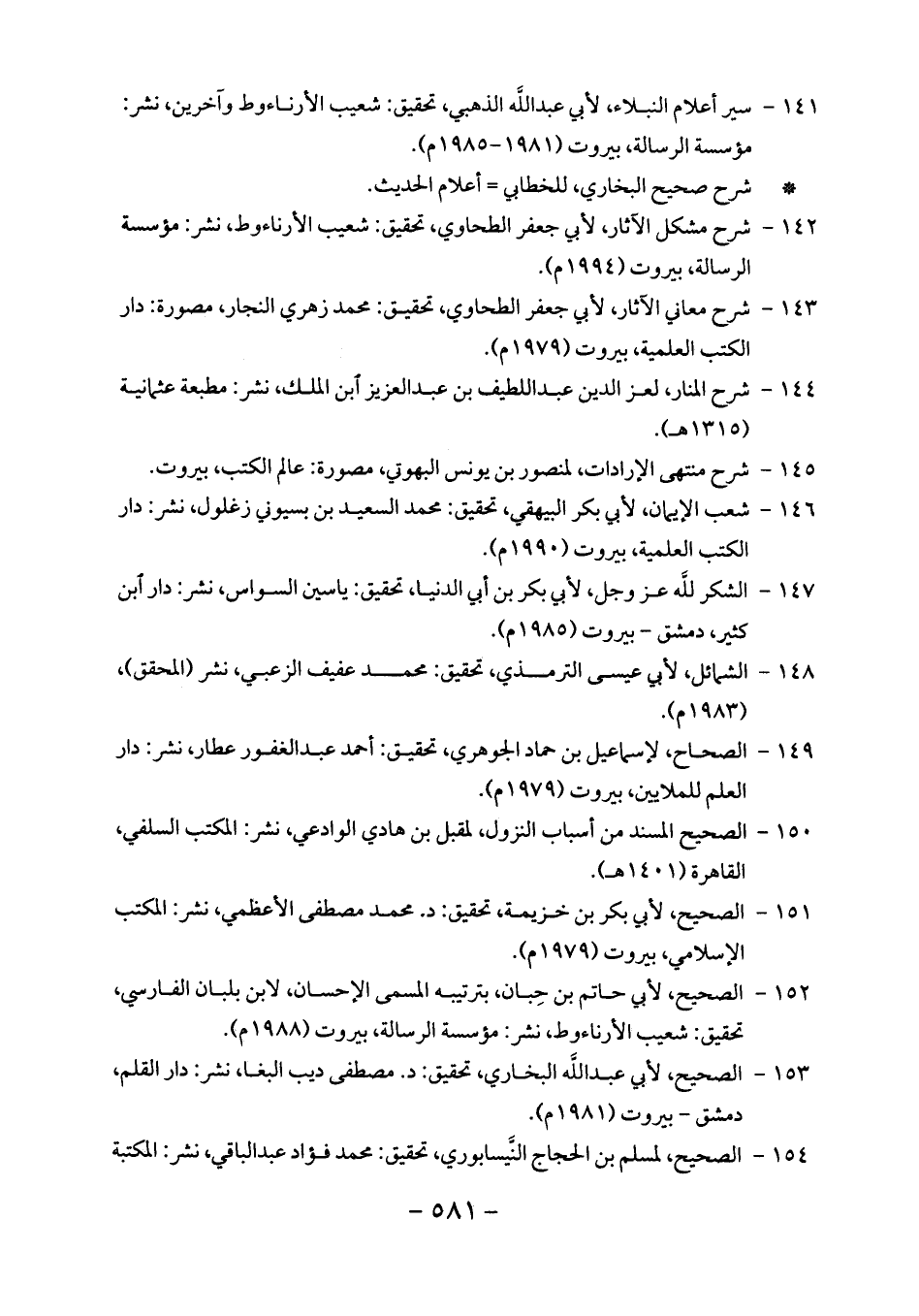 142 - شرح مشكل الآثار، لأبي جعفر الطحاوي، تحقيق: شعيب الأرناءوط، نشر: مؤسسة الرسالة، بيروت (1994 م).