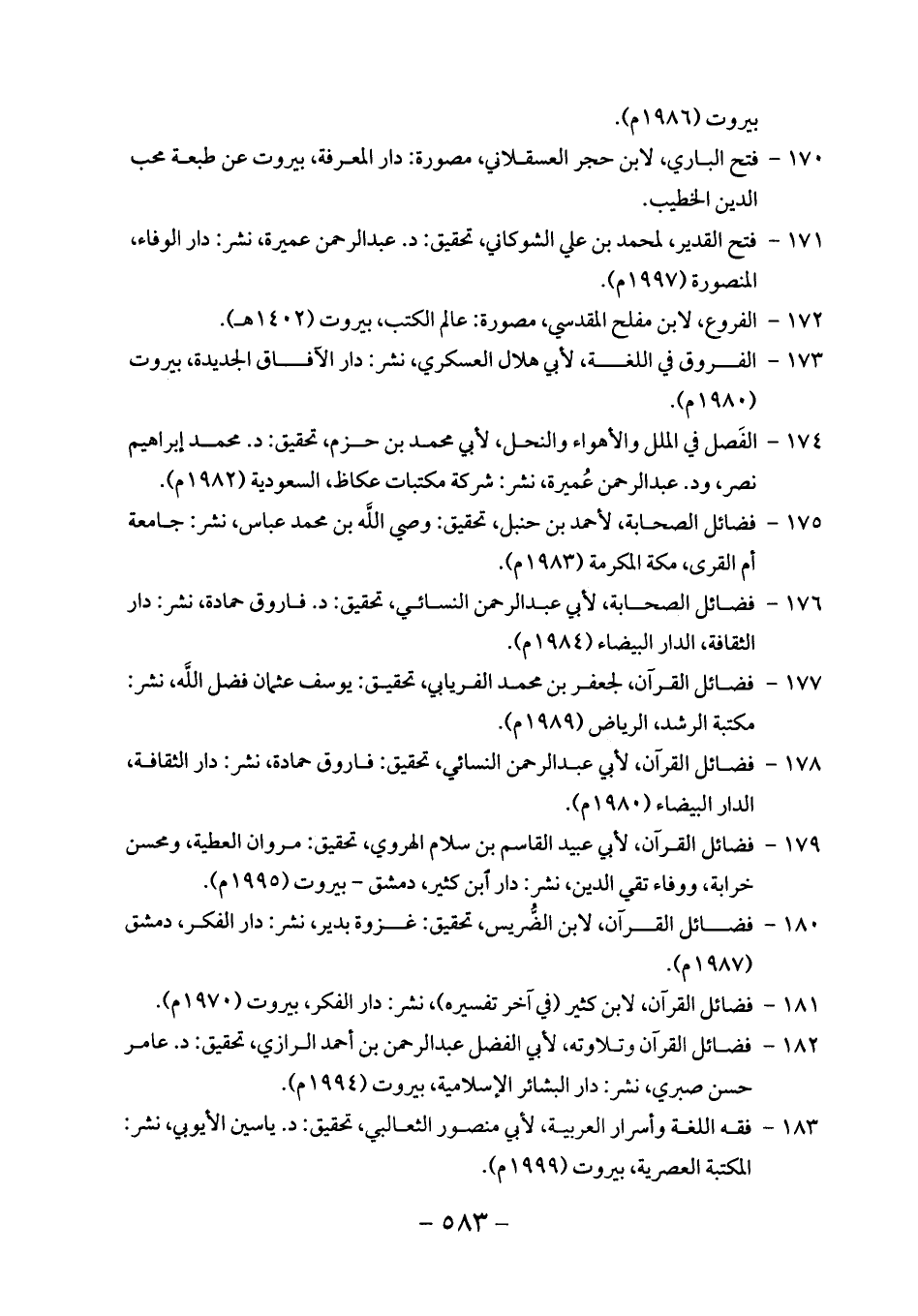 179 - فضائل القرآن، لأبي عبيد القاسم بن سلام الهروي، تحقيق: مروان العطية، ومحسن خرابة، ووفاء تقي الدين، نشر: دار ابن كثير، دمشق- بيروت (1995 م).