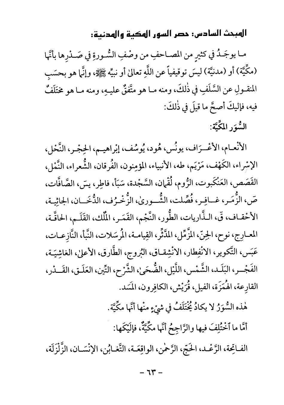 ما يوجد في كثير من المصاحف من وصف السّورة في صدرها بأنّها (مكّيّة) أو (مدنيّة) ليس توقيفيا عن الله تعالى أو نبيّه صلى الله عليه وسلم، وإنّما هو بحسب المنقول عن السّلف في ذلك، ومنه ما هو متّفق عليه، ومنه ما هو مختلف فيه، فإليك أصحّ ما قيل في ذلك: