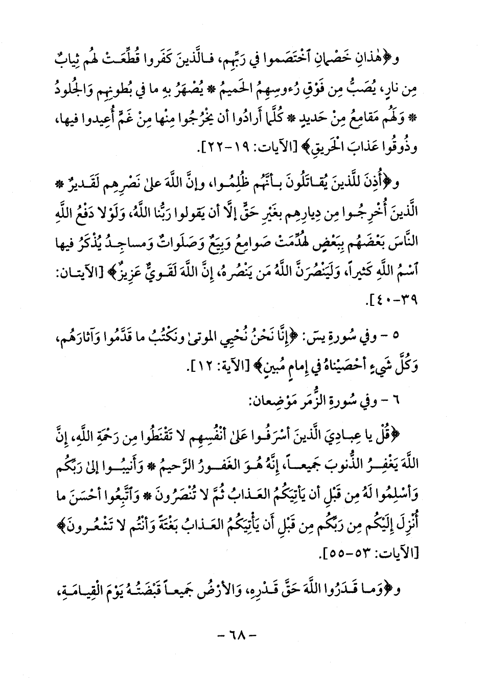 قُلْ يا عِبادِيَ الَّذِينَ أَسْرَفُوا عَلى أَنْفُسِهِمْ لا تَقْنَطُوا مِنْ رَحْمَةِ اللَّهِ إِنَّ اللَّهَ يَغْفِرُ الذُّنُوبَ جَمِيعاً إِنَّهُ هُوَ الْغَفُورُ الرَّحِيمُ (53) وَأَنِيبُوا إِلى رَبِّكُمْ وَأَسْلِمُوا لَهُ مِنْ قَبْلِ أَنْ يَأْتِيَكُمُ الْعَذابُ ثُمَّ لا تُنْصَرُونَ (54) وَاتَّبِعُوا أَحْسَنَ ما أُنْزِلَ إِلَيْكُمْ مِنْ رَبِّكُمْ مِنْ قَبْلِ أَنْ يَأْتِيَكُمُ الْعَذابُ بَغْتَةً وَأَنْتُمْ لا تَشْعُرُونَ 55 [الآيات: 53 - 55].