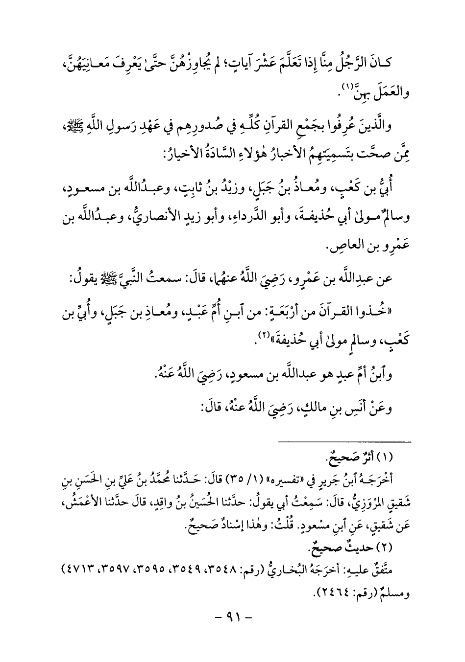 «خذوا القرآن من أربعة: من ابن أمّ عبد، ومعاذ بن جبل، وأبيّ بن كعب، وسالم مولى أبي حذيفة» (¬2).