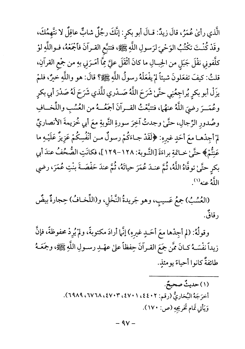 نتّهمك، وقد كنت تكتب الوحي لرسول الله صلى الله عليه وسلم، فتتبّع القرآن فاجمعه، فو الله لو كلّفوني نقل جبل من الجبال ما كان أثقل عليّ ممّا أمرني به من جمع القرآن، قلت: كيف تفعلون شيئا لم يفعله رسول الله صلى الله عليه وسلم؟ قال: هو والله خير، فلم يزل أبو بكر يراجعني حتّى شرح الله صدري للّذي شرح له صدر أبي بكر وعمر رضي الله عنهما، فتتبّعت القرآن أجمعه من العسب واللّخاف وصدور الرّجال، حتّى وجدت آخر سورة التّوبة مع أبي خزيمة الأنصاريّ لم أجدها مع أحد غيره: لَقَدْ جاءَكُمْ رَسُولٌ مِنْ أَنْفُسِكُمْ عَزِيزٌ عَلَيْهِ ما عَنِتُّمْ حتّى خاتمة براءة [التّوبة: 128 - 129]، فكانت الصّحف عند أبي بكر حتّى توفّاه الله، ثمّ عند عمر حياته، ثمّ عند حفصة بنت عمر، رضي الله عنه (¬1).
