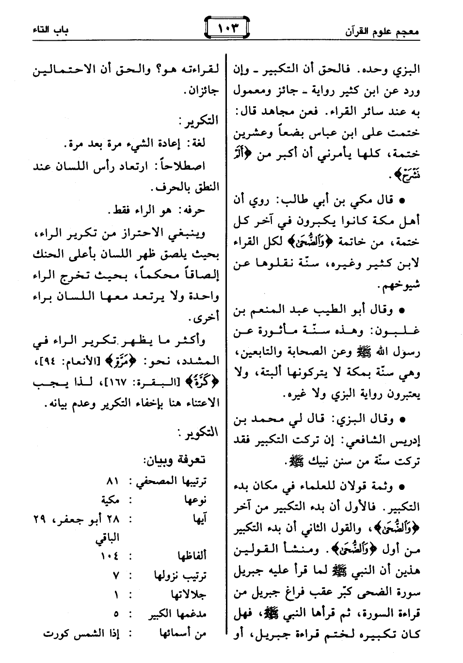 ترتيبها المصحفي: 81 نوعها: مكية آيها: 28 أبو جعفر، 29 الباقي ألفاظها: 104 ترتيب نزولها: 7 جلالاتها: 1 مدغمها الكبير: 5 من أسمائها: إذا الشمس كورت