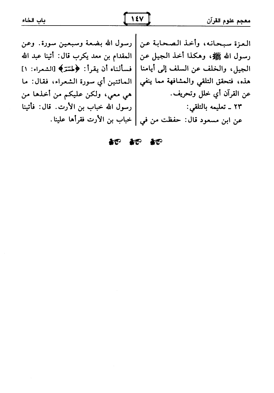 عن ابن مسعود قال: حفظت من في رسول الله بضعة وسبعين سورة. وعن المقدام بن معد يكرب قال: أتينا عبد الله فسألناه أن يقرأ: طسم [الشعراء: 1] المائتين أي سورة الشعراء، فقال: ما هي معي، ولكن عليكم من أخذها من رسول الله خباب بن الأرت. قال: فأتينا خباب بن الأرت فقرأها علينا.