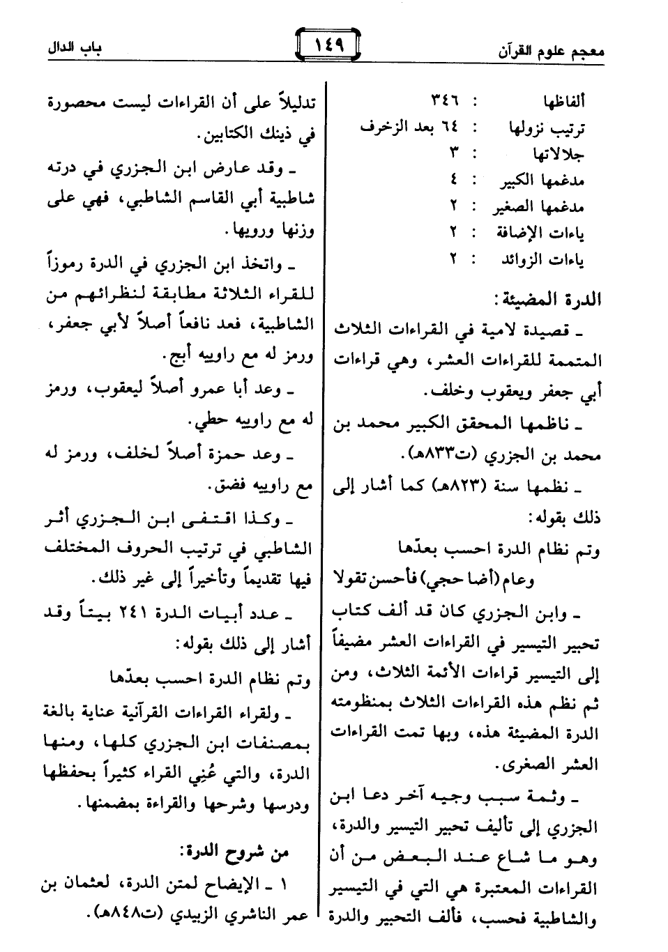 - وابن الجزري كان قد ألف كتاب تحبير التيسير في القراءات العشر مضيفا إلى التيسير قراءات الأئمة الثلاث، ومن ثم نظم هذه القراءات الثلاث بمنظومته الدرة المضيئة هذه، وبها تمت القراءات العشر الصغرى.