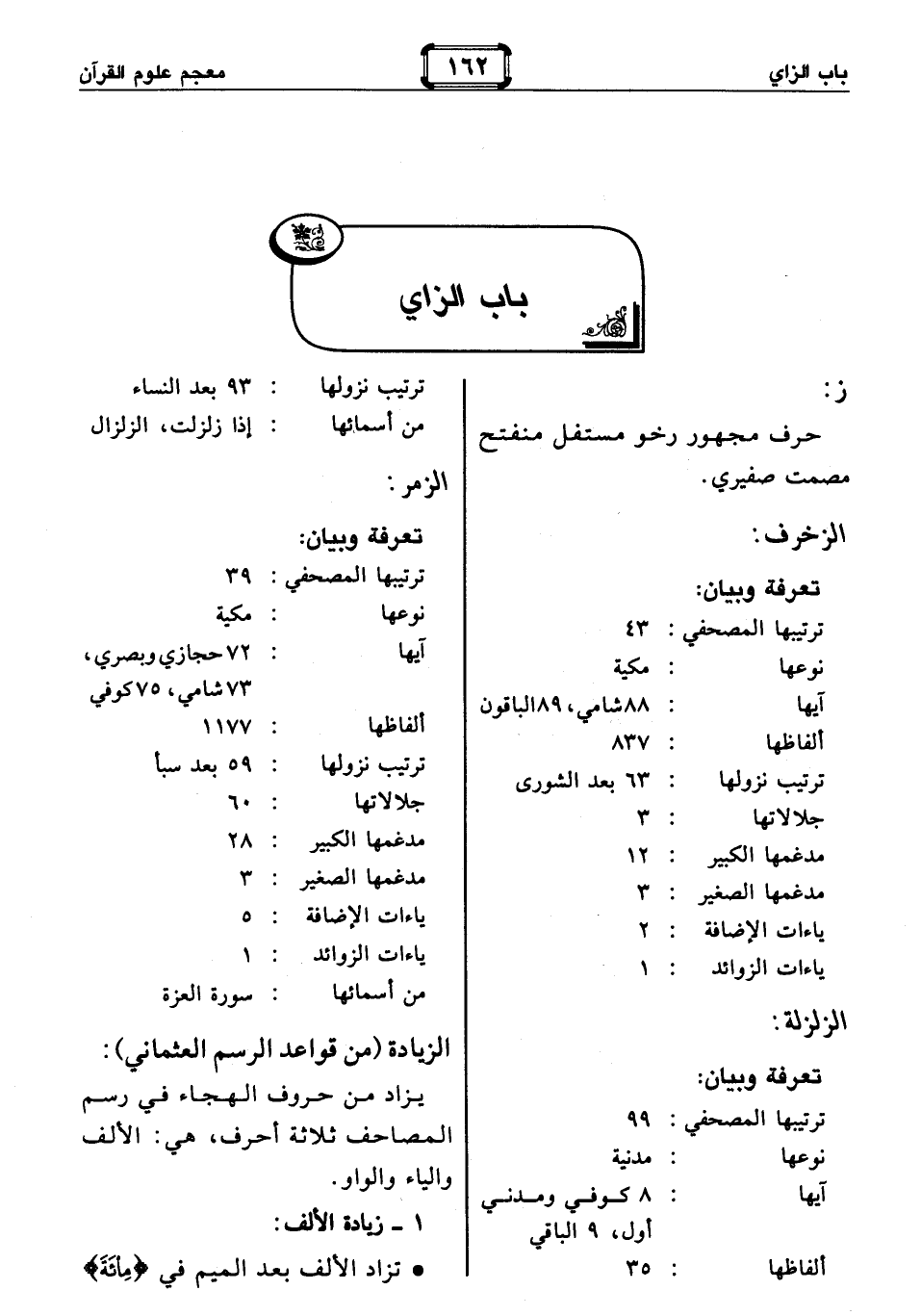 : ترتيبها المصحفي: 43 نوعها: مكية آيها: 88 شامي، 89 الباقون ألفاظها: 837 ترتيب نزولها: 63 بعد الشورى جلالاتها: 3 مدغمها الكبير: 12 مدغمها الصغير: 3 ياءات الإضافة: 2 ياءات الزوائد: 1