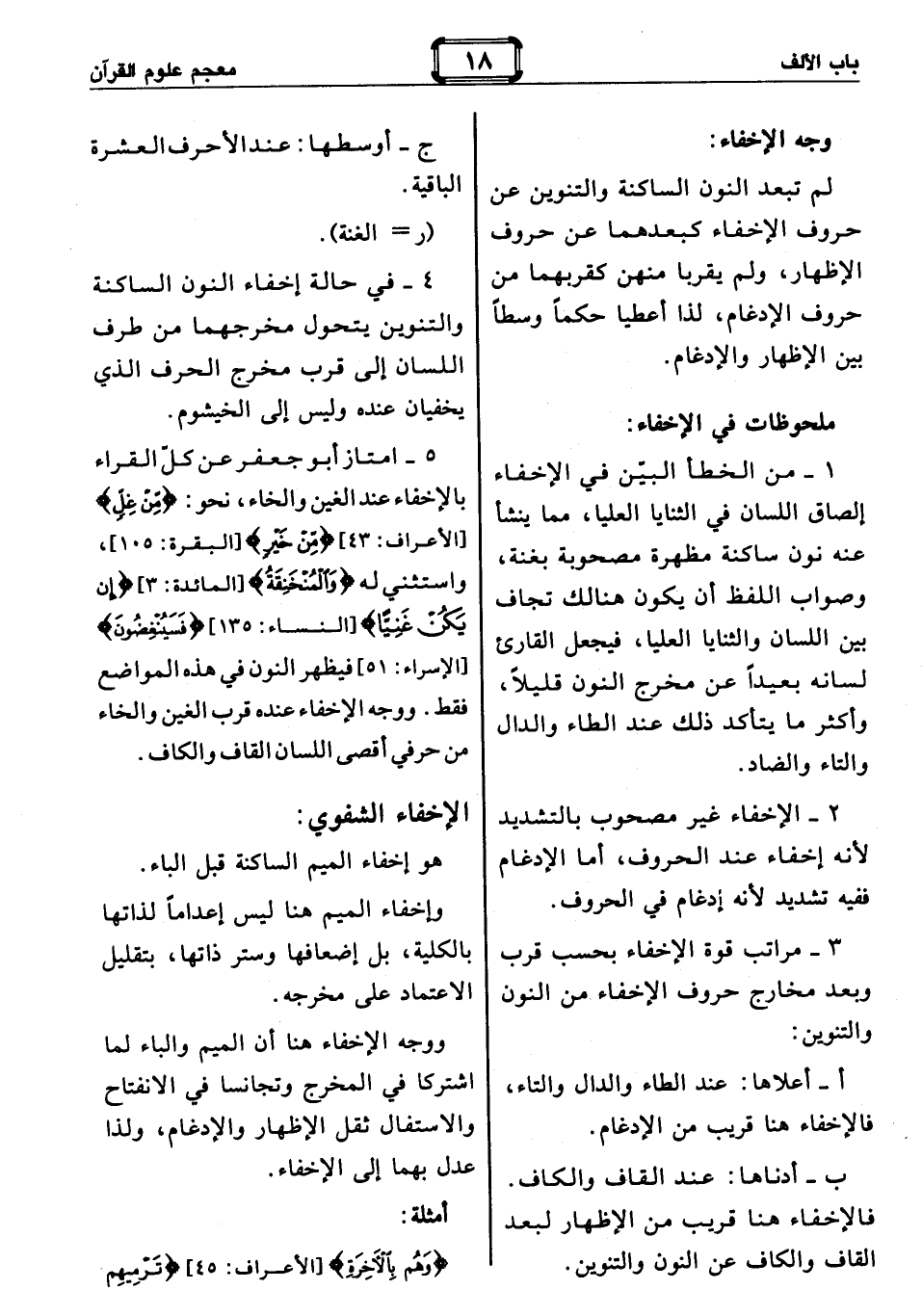 : 1 - من الخطأ البيّن في الإخفاء إلصاق اللسان في الثنايا العليا، مما ينشأ عنه نون ساكنة مظهرة مصحوبة بغنة، وصواب اللفظ أن يكون هنالك تجاف بين اللسان والثنايا العليا، فيجعل القارئ لسانه بعيدا عن مخرج النون قليلا، وأكثر ما يتأكد ذلك عند الطاء والدال والتاء والضاد.