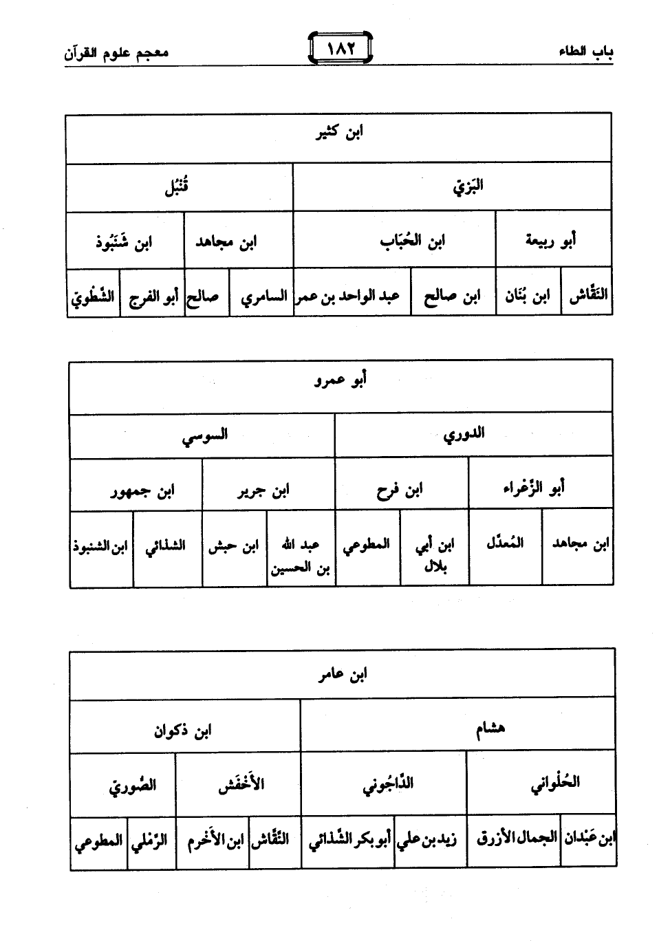 ابن كثير البزيّ/ قنبل أبو ربيعة/ ابن الحباب/ ابن مجاهد/ ابن شنبوذ النقّاش/ ابن بنان/ ابن صالح/ عبد الواحد بن عمر/ السامري/ صالح/ أبو الفرج/ الشّطويّ أبو عمرو الدوري/ السوسي أبو الزّعراء/ ابن فرح/ ابن جرير/ ابن جمهور ابن مجاهد/ المعدّل/ ابن أبي بلال/ المطوعي/ عبد الله بن الحسين/ ابن حبش/ الشذائي/ ابن الشنبوذ ابن عامر هشام/ ابن ذكوان الحلواني/ الدّاجوني/ الأخفش/ الصّوريّ ابن عبدان/ الجمال الأزرق/ زيد بن علي/ أبو بكر الشّذائي/ النّقّاش/ ابن الأخرم/ الرّملي/ المطوعي