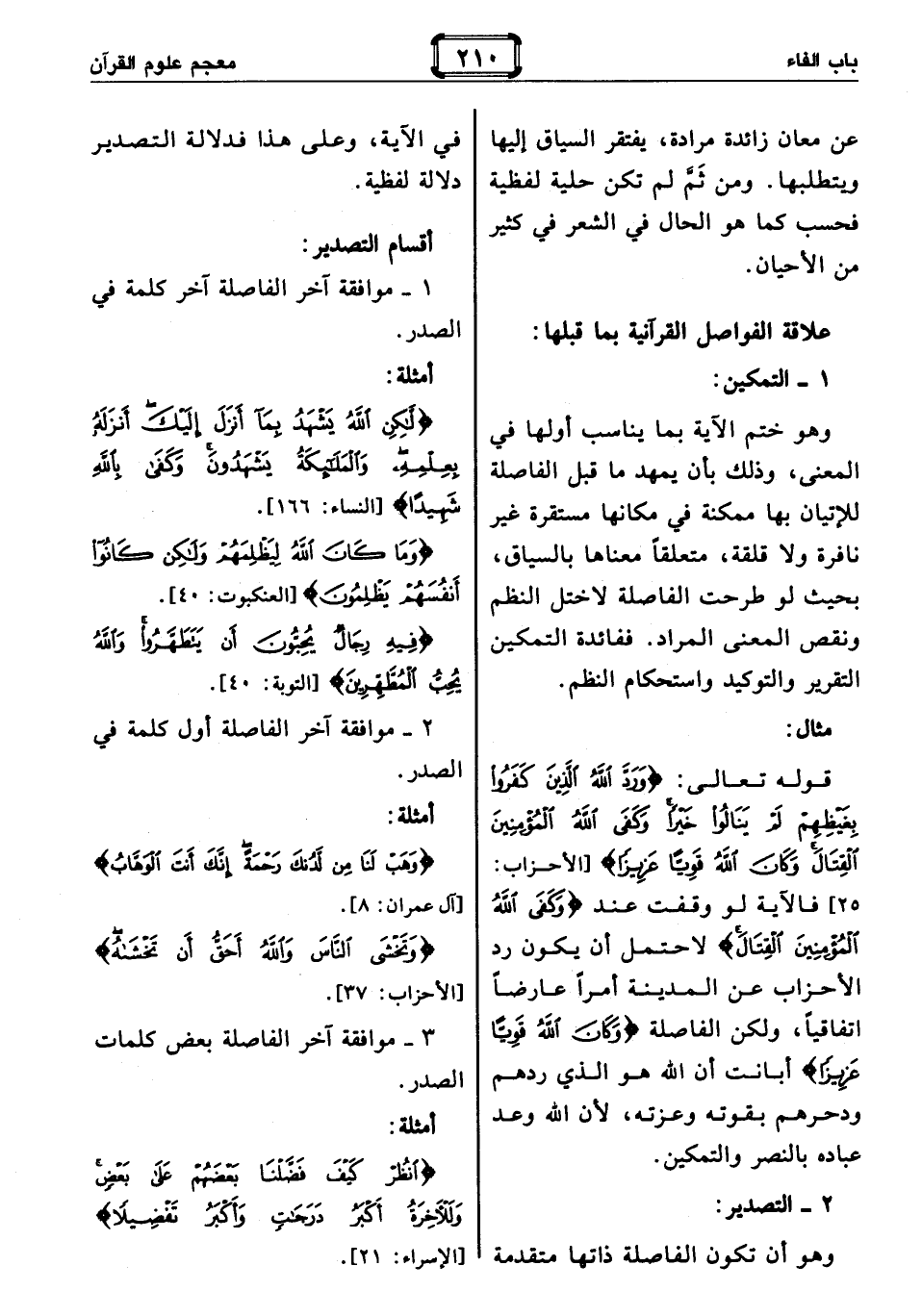 : وهو ختم الآية بما يناسب أولها في المعنى، وذلك بأن يمهد ما قبل الفاصلة للإتيان بها ممكنة في مكانها مستقرة غير نافرة ولا قلقة، متعلقا معناها بالسياق، بحيث لو طرحت الفاصلة لاختل النظم ونقص المعنى المراد. ففائدة التمكين التقرير والتوكيد واستحكام النظم.