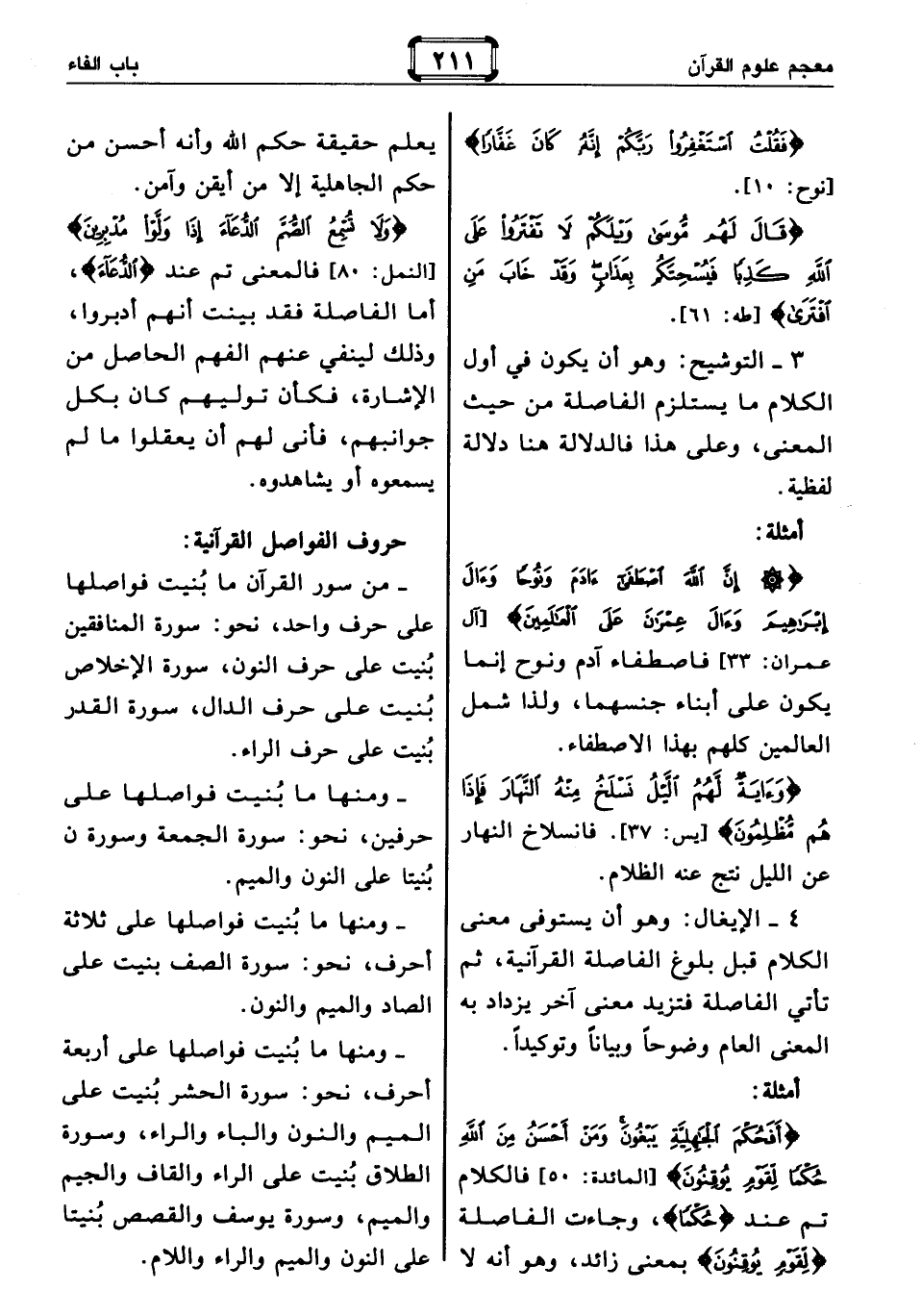 - ومنها ما بنيت فواصلها على أربعة أحرف، نحو: سورة الحشر بنيت على الميم والنون والباء والراء، وسورة الطلاق بنيت على الراء والقاف والجيم والميم، وسورة يوسف والقصص بنيتا على النون والميم والراء واللام.