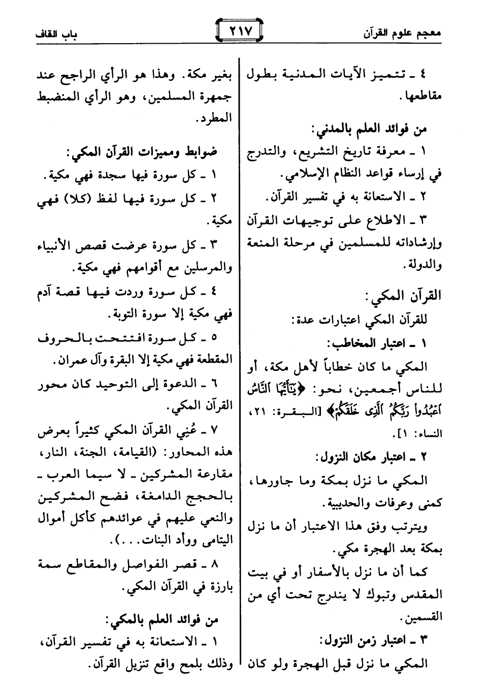 : المكي ما كان خطابا لأهل مكة، أو للناس أجمعين، نحو: يا أَيُّهَا النَّاسُ اعْبُدُوا رَبَّكُمُ الَّذِي خَلَقَكُمْ [البقرة: 21، النساء: 1].