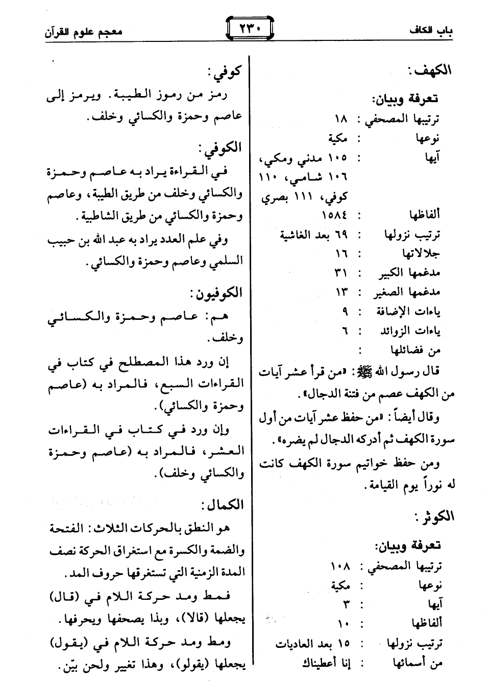 : ترتيبها المصحفي: 18 نوعها: مكية آيها: 105 مدني ومكي، 106 شامي، 110 كوفي، 111 بصري ألفاظها: 1584 ترتيب نزولها: 69 بعد الغاشية جلالاتها: 16 مدغمها الكبير: 31 مدغمها الصغير: 13 ياءات الإضافة: 9 ياءات الزوائد: 6 من فضائلها: