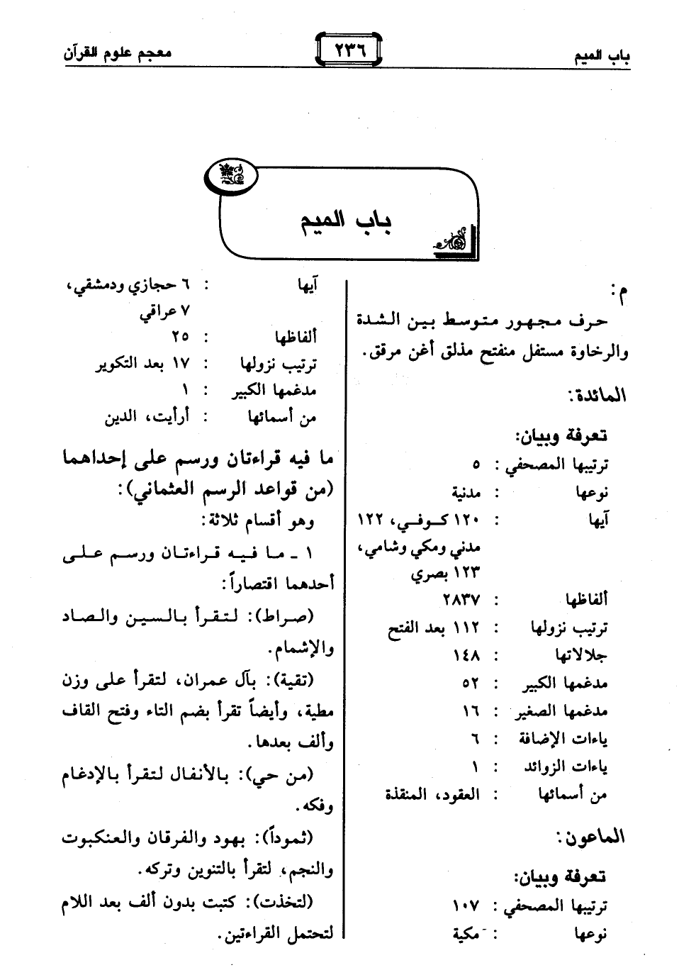 : ترتيبها المصحفي: 107 نوعها: مكية آيها: 6 حجازي ودمشقي، 7 عراقي ألفاظها: 25 ترتيب نزولها: 17 بعد التكوير مدغمها الكبير: 1 من أسمائها: أرأيت، الدين