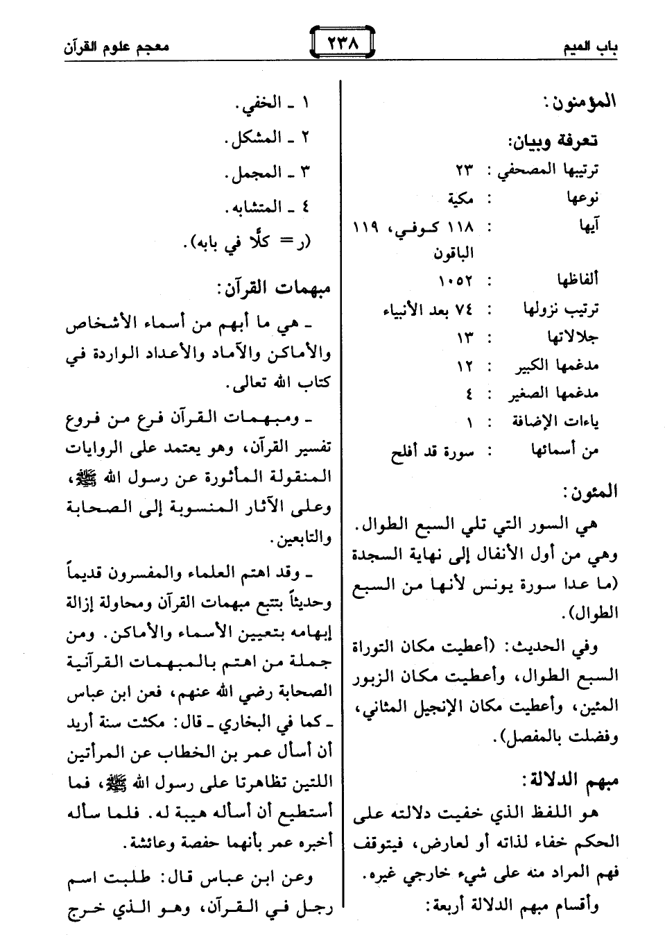 : ترتيبها المصحفي: 23 نوعها: مكية آيها: 118 كوفي، 119 الباقون ألفاظها: 1052 ترتيب نزولها: 74 بعد الأنبياء جلالاتها: 13 مدغمها الكبير: 12 مدغمها الصغير: 4 ياءات الإضافة: 1 من أسمائها: سورة قد أفلح
