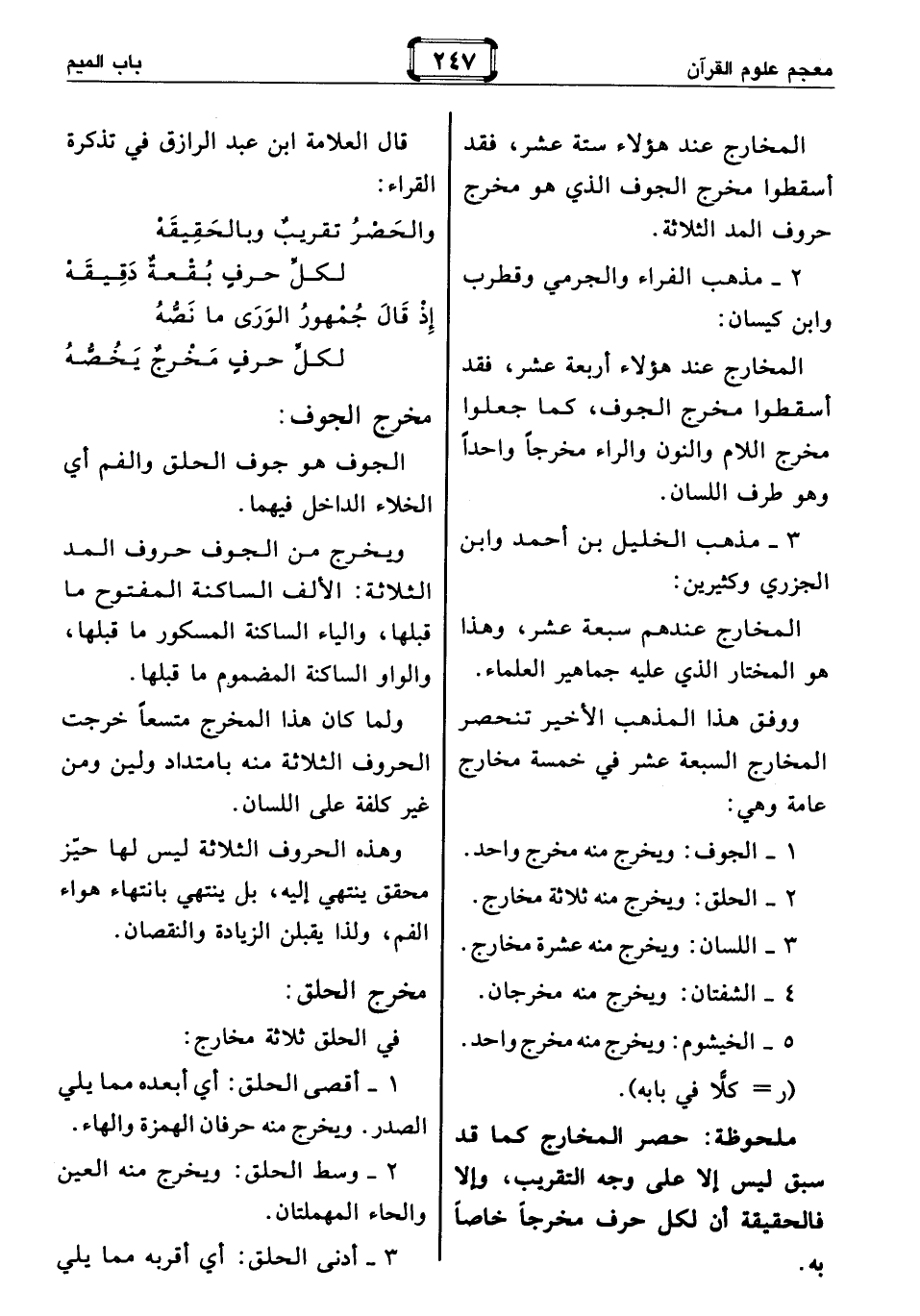 ملحوظة: حصر المخارج كما قد سبق ليس إلا على وجه التقريب، وإلا فالحقيقة أن لكل حرف مخرجا خاصا به.