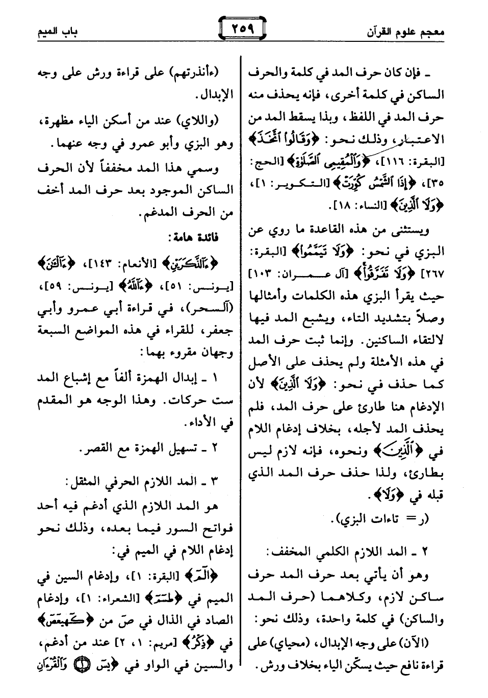 267] وَلا تَفَرَّقُوا [آل عمران: 103] حيث يقرأ البزي هذه الكلمات وأمثالها وصلا بتشديد التاء، ويشبع المد فيها لالتقاء الساكنين. وإنما ثبت حرف المد في هذه الأمثلة ولم يحذف على الأصل كما حذف في نحو: وَلَا الَّذِينَ لأن الإدغام هنا طارئ على حرف المد، فلم يحذف المد لأجله، بخلاف إدغام اللام في الَّذِينَ ونحوه، فإنه لازم ليس بطارئ، ولذا حذف حرف المد الذي قبله في وَلَا.
