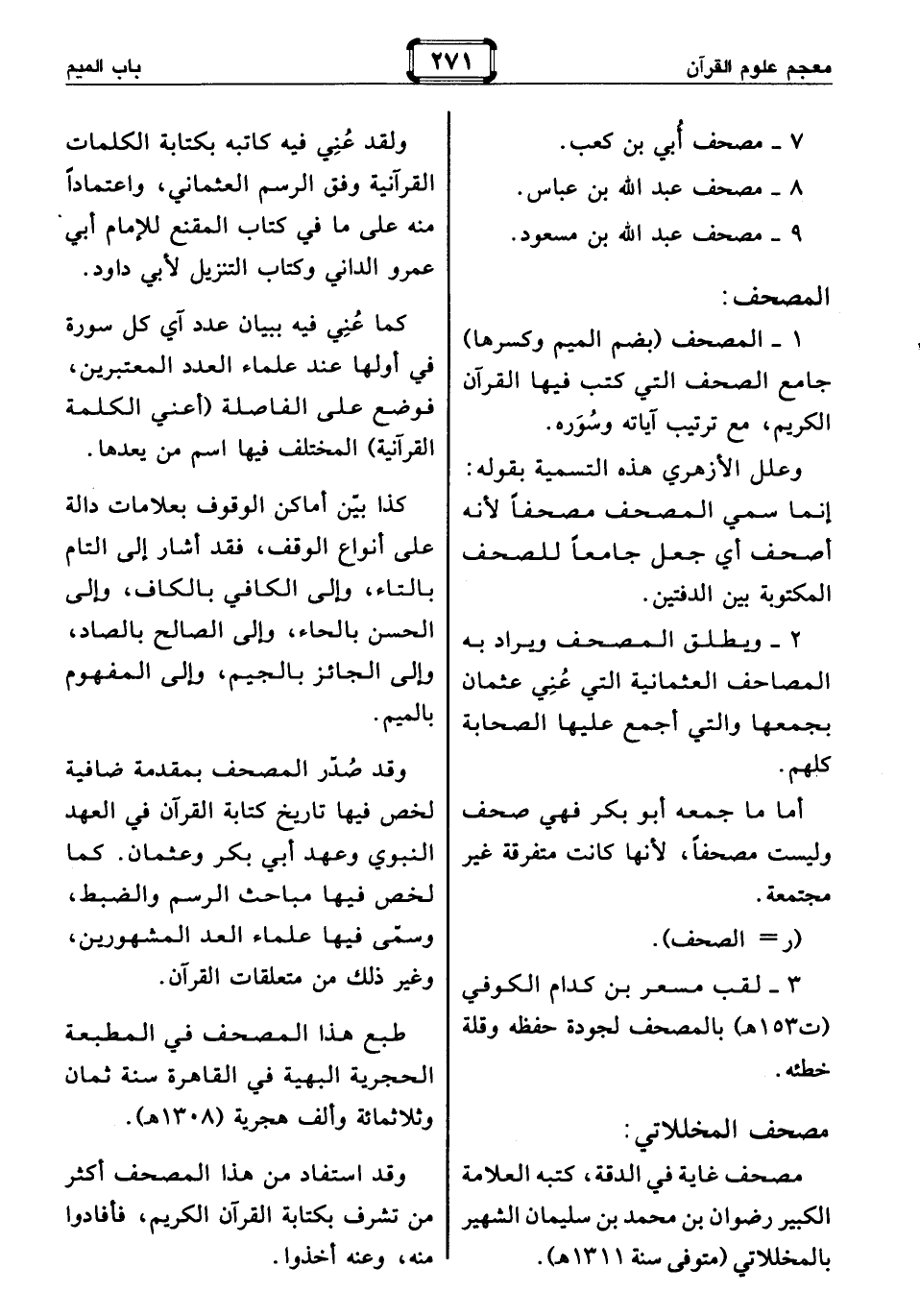 2 - ويطلق المصحف ويراد به المصاحف العثمانية التي عني عثمان بجمعها والتي أجمع عليها الصحابة كلهم.