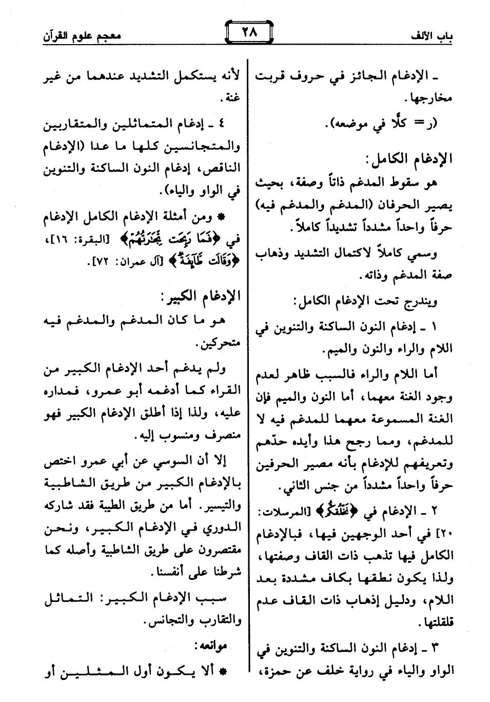 * ومن أمثلة الإدغام الكامل الإدغام في فَما رَبِحَتْ تِجارَتُهُمْ [البقرة: 16]، وَقالَتْ طائِفَةٌ [آل عمران: 72].