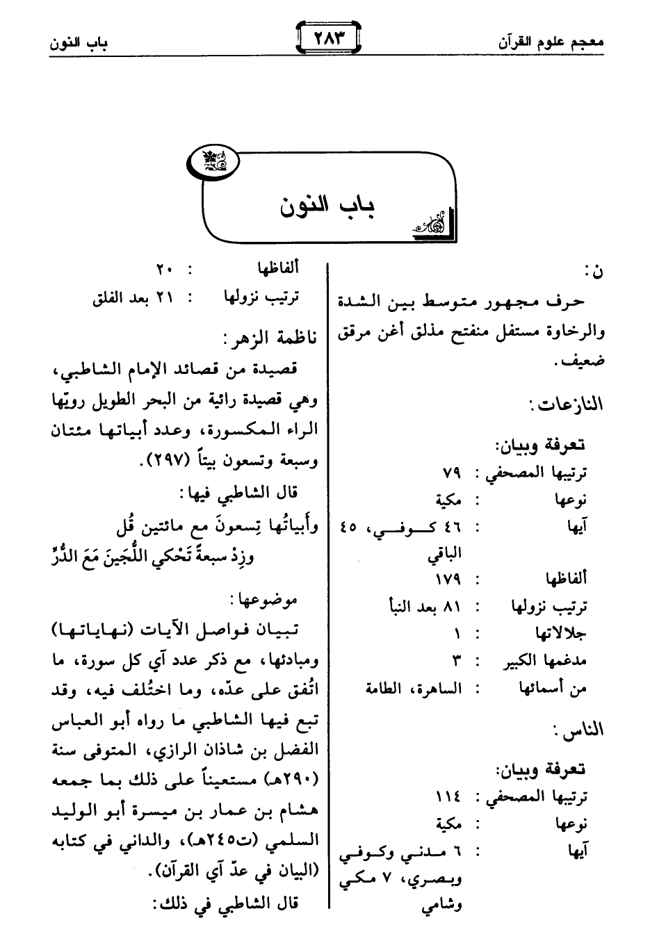 : تبيان فواصل الآيات (نهاياتها) ومبادئها، مع ذكر عدد آي كل سورة، ما اتفق على عدّه، وما اختلف فيه، وقد تبع فيها الشاطبي ما رواه أبو العباس الفضل بن شاذان الرازي، المتوفى سنة (290 هـ) مستعينا على ذلك بما جمعه هشام بن عمار بن ميسرة أبو الوليد السلمي (ت 245 هـ)، والداني في كتابه (البيان في عدّ آي القرآن).