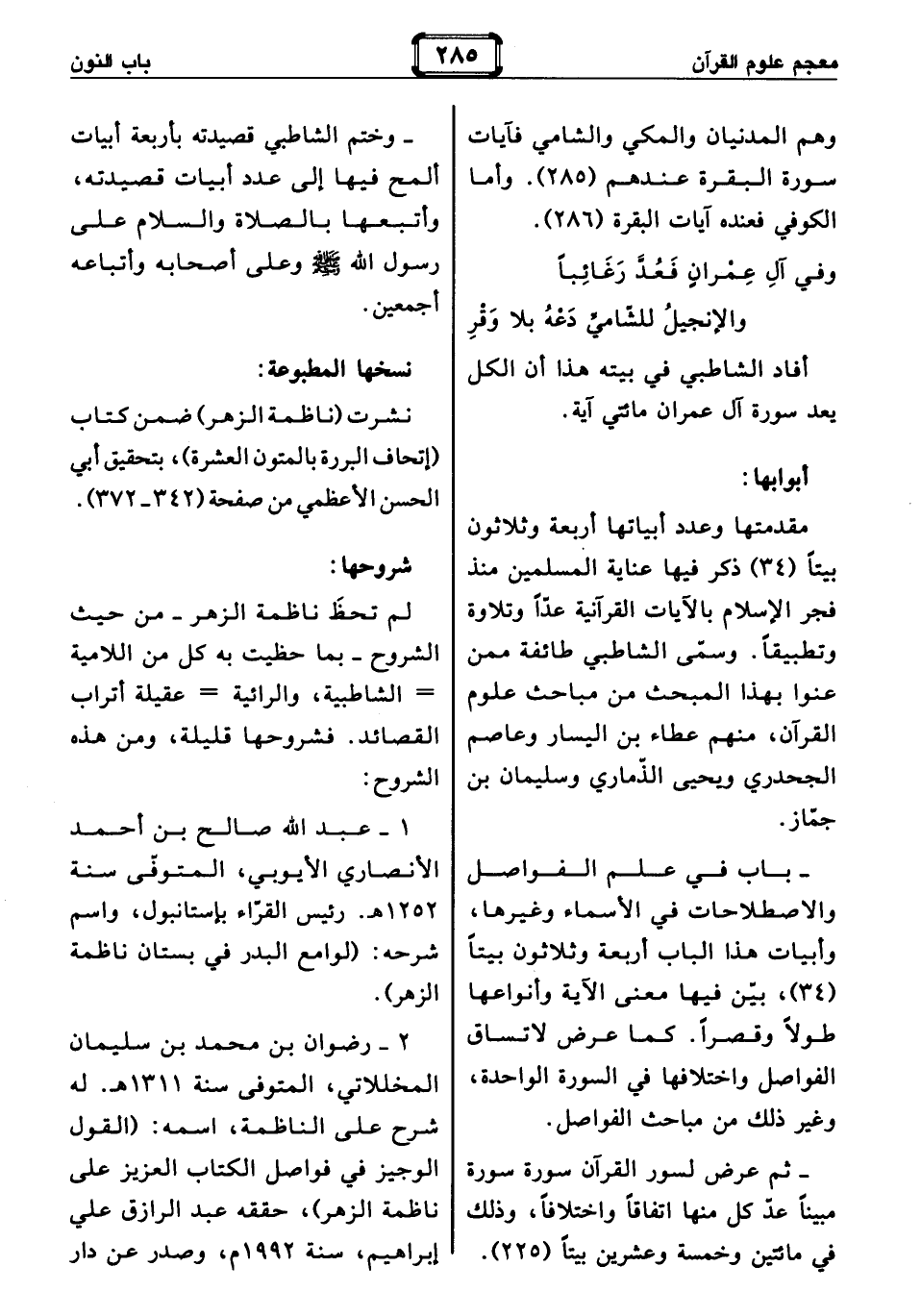 - ثم عرض لسور القرآن سورة سورة مبينا عدّ كل منها اتفاقا واختلافا، وذلك في مائتين وخمسة وعشرين بيتا (225).