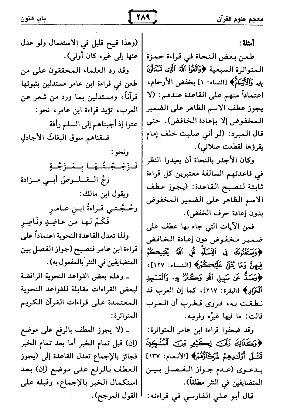 : طعن بعض النحاة في قراءة حمزة المتواترة السبعية وَاتَّقُوا اللَّهَ الَّذِي تَسائَلُونَ بِهِ وَالْأَرْحامَ [النساء: 1] بخفض الأرحام، اعتمادا منهم على القاعدة عندهم: (لا يجوز عطف الاسم الظاهر على الضمير المخفوض إلا بإعادة الخافض). حتى قال المبرد: (لو أني صليت خلف إمام يقرؤها لقطعت صلاتي).