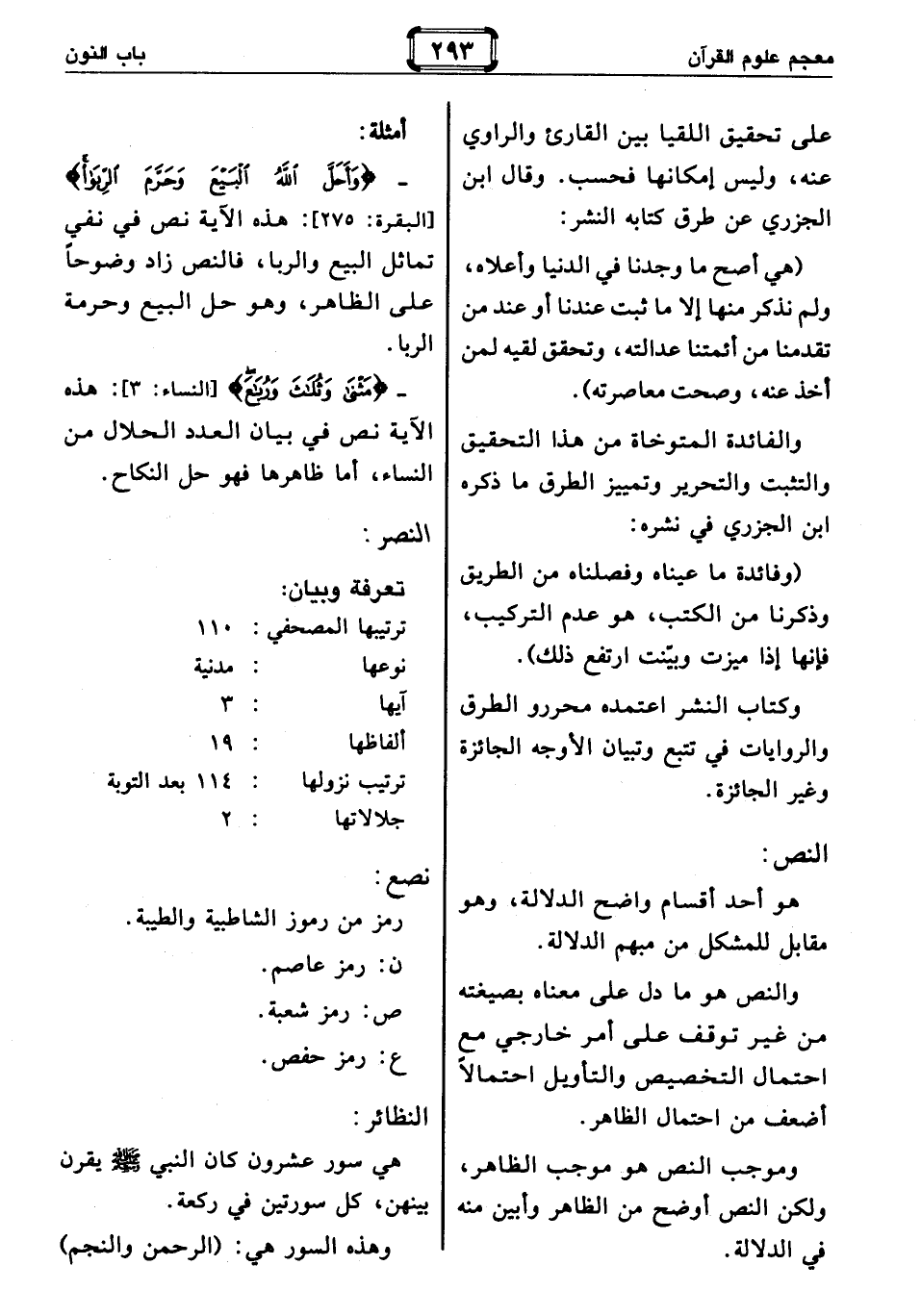:- وَأَحَلَّ اللَّهُ الْبَيْعَ وَحَرَّمَ الرِّبا [البقرة: 275]: هذه الآية نص في نفي تماثل البيع والربا، فالنص زاد وضوحا على الظاهر، وهو حل البيع وحرمة الربا.