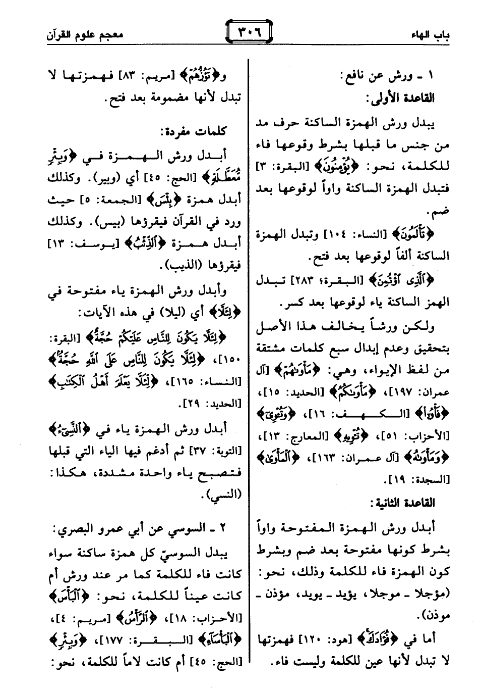 ولكن ورشا يخالف هذا الأصل بتحقيق وعدم إبدال سبع كلمات مشتقة من لفظ الإيواء، وهي: مَأْواهُمْ [آل عمران: 197]، ماؤُكُمْ [الحديد: 15]، فَأْوُوا [الكهف: 16]، وتئوى [الأحزاب: 51]، تئويه [المعارج: 13]، وَمَأْواهُ [آل عمران: 163]، الْمَأْوى [السجدة: 19].