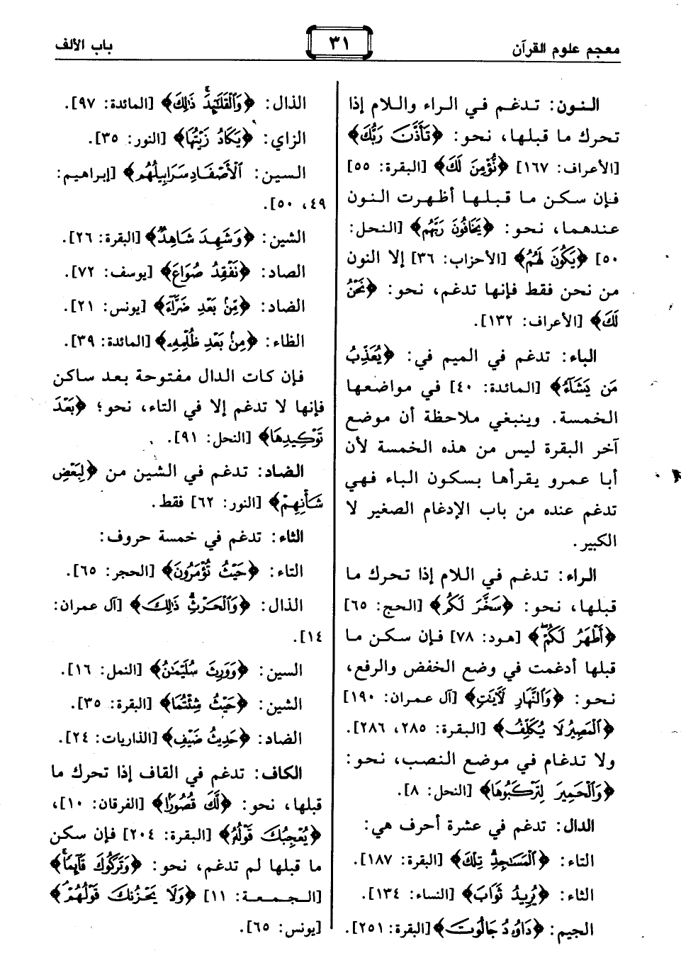الراء: تدغم في اللام إذا تحرك ما قبلها، نحو: سَخَّرَ لَكُمْ [الحج: 65] أَطْهَرُ لَكُمْ [هود: 78] فإن سكن ما قبلها أدغمت في وضع الخفض والرفع، نحو: وَالنَّهارِ لَآياتٍ [آل عمران: 190] الْمَصِيرُ لا يُكَلِّفُ [البقرة: 285، 286].
