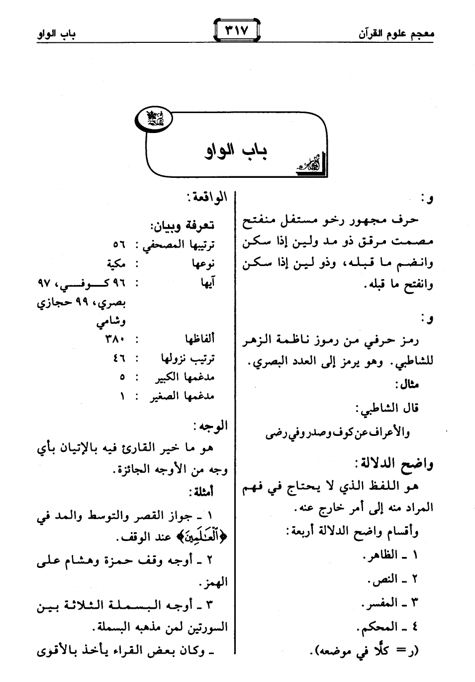 و: رمز حرفي من رموز ناظمة الزهر للشاطبي. وهو يرمز إلى العدد البصري.