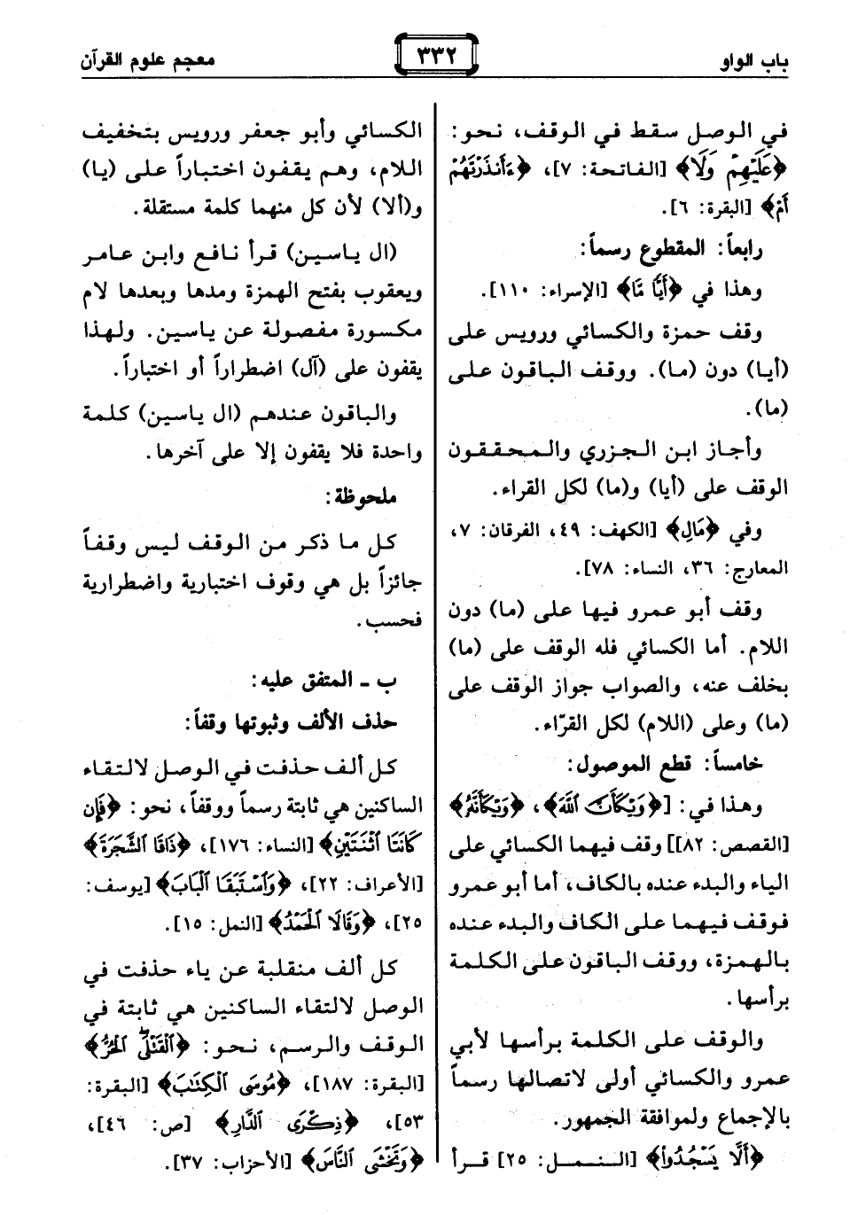 كل ألف منقلبة عن ياء حذفت في الوصل لالتقاء الساكنين هي ثابتة في الوقف والرسم، نحو: الْقَتْلى الْحُرُّ [البقرة: 187]، مُوسَى الْكِتابَ [البقرة: