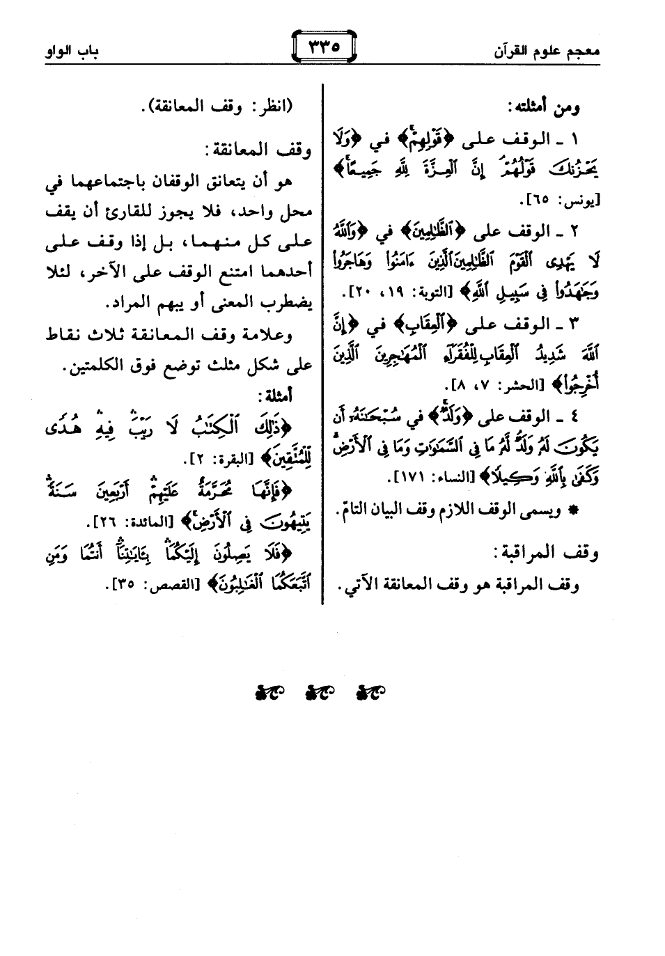 : هو أن يتعانق الوقفان باجتماعهما في محل واحد، فلا يجوز للقارئ أن يقف على كل منهما، بل إذا وقف على أحدهما امتنع الوقف على الآخر، لئلا يضطرب المعنى أو يبهم المراد.