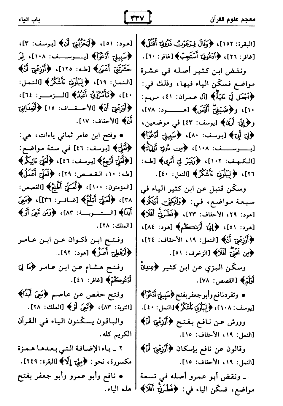 10]، وضَيْفِي أَلَيْسَ [هود: 78]، وإِنِّي أَرى [يوسف: 43] في موضعين، لِي أَبِي [يوسف: 80]، سَبِيلِي أَدْعُوا [يوسف: 108]، مِنْ دُونِي أَوْلِياءَ [الكهف: 102]، وَيَسِّرْ لِي أَمْرِي [طه: