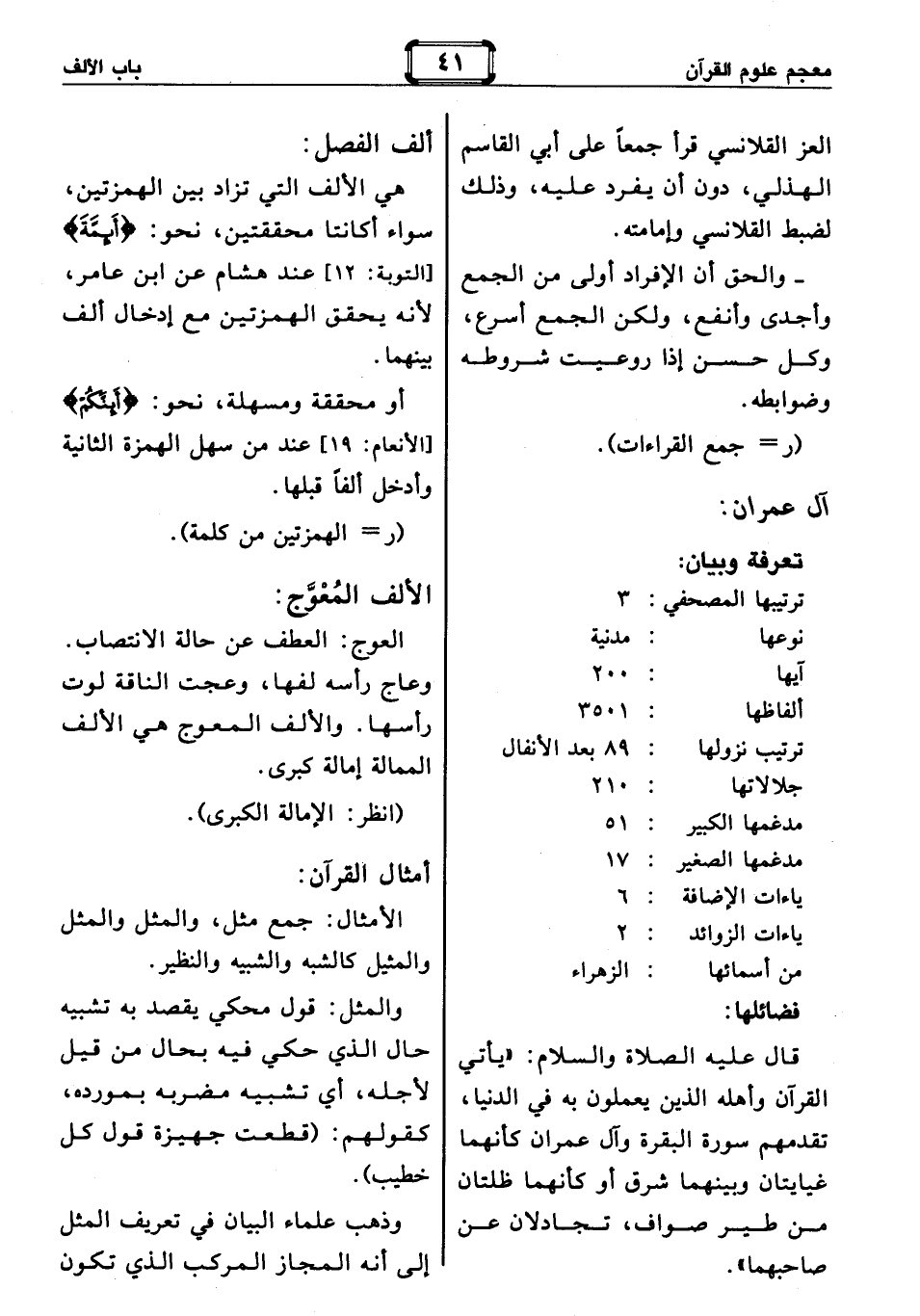 : ترتيبها المصحفي: 3 نوعها: مدنية آيها: 200 ألفاظها: 3501 ترتيب نزولها: 89 بعد الأنفال جلالاتها: 210 مدغمها الكبير: 51 مدغمها الصغير: 17 ياءات الإضافة: 6 ياءات الزوائد: 2 من أسمائها: الزهراء